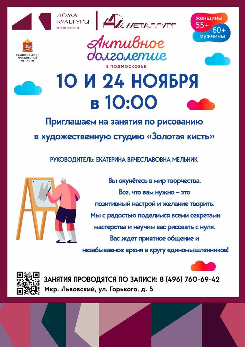 ✨ Приглашаем участников клуба "Активное долголетие" на занятия в мкр-не Львовский Нарисуем новые шедевры в художественной студии "Золотая кисть" 🖌️🎨 А ещё у нас танцы и пение 🎤 Все, чтобы весело провести время 🚫 Возраст: 55+ 🏢 Дом культуры «Металлург» 📍 г.о. Подольск, мкр-н Львовский, ул. Горького, д. 5 💰 Вход свободный❗️ ⭐Поддержать канал голосом 🍰Где поесть в Подольске ✅ Мероприятия Подольск https://dzen.ru/id/66ed500f7b5671493eca3fd6 http://vk.com/podolsk_events http://dzen.ru/podolsk_events
