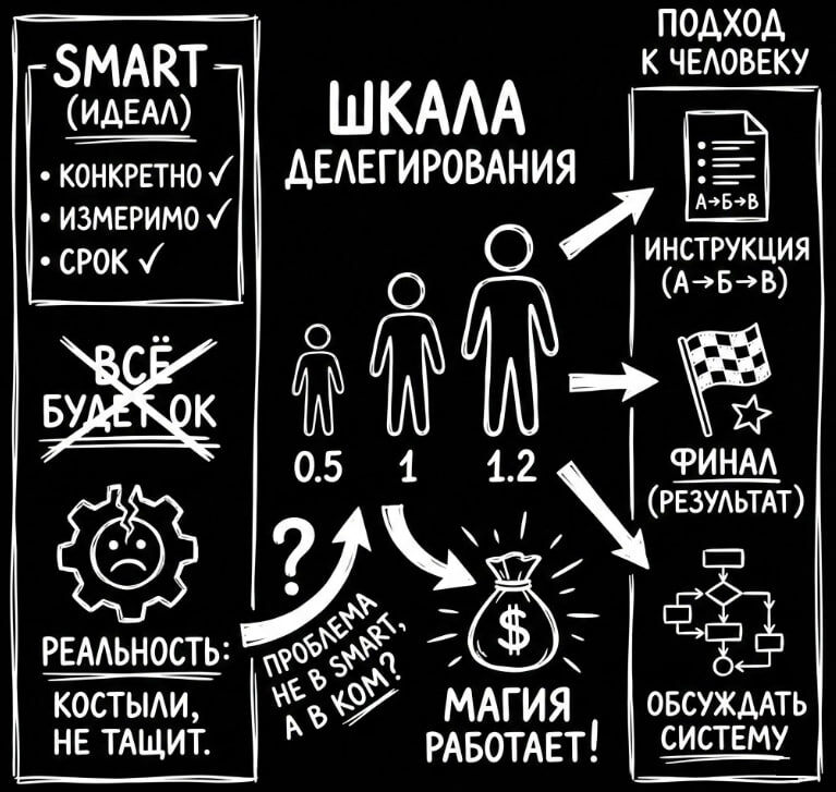Долгое время я верил в одну простую сказку: если ставить задачи по SMART, всё будет ок ... Звучит круто 🔥, правда? - Конкретно, - измеримо, - срок, - ответственность - ну что тут может пойти не так... ? Не знаю как у других, но у меня не завелось, спустя тысячи попыток. Ставлю задачу разработчику: Сделать интеграцию с CRM, описываю сценарии, критерии готовности, дедлайн, риски. Прямо учебный кейс по SMART 🫡 Он кивает: "понял, сделаю". Я выдыхаю. Ставлю себе галочку "Красавчик, поставил по смарту" В день Х получаю результат. Формально всё по ТЗ, но: костыли, нет логов, нет обработки ошибок, нагрузку не держит. Технически задача выполнена. По факту продукт тащит за уши еще несколько людей. И так не один раз. Каждый раз думал, надо лучше и детальнее прописывать. Делаю, всё умнее формулирую. Но чем умнее становился мой СМАРТ, тем больнее прилетало на этапе реализации. В какой-то момент до меня дошло простое, но неприятное: проблема не в формулировке задачи, а в том, кому я её ста