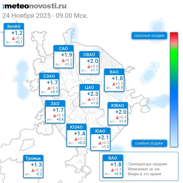 В 9:00 в Москве было от +0.9°C до +2.4°C, средняя температура +1.8°C #погода #Москва #осень #температура #24ноября #понедельник