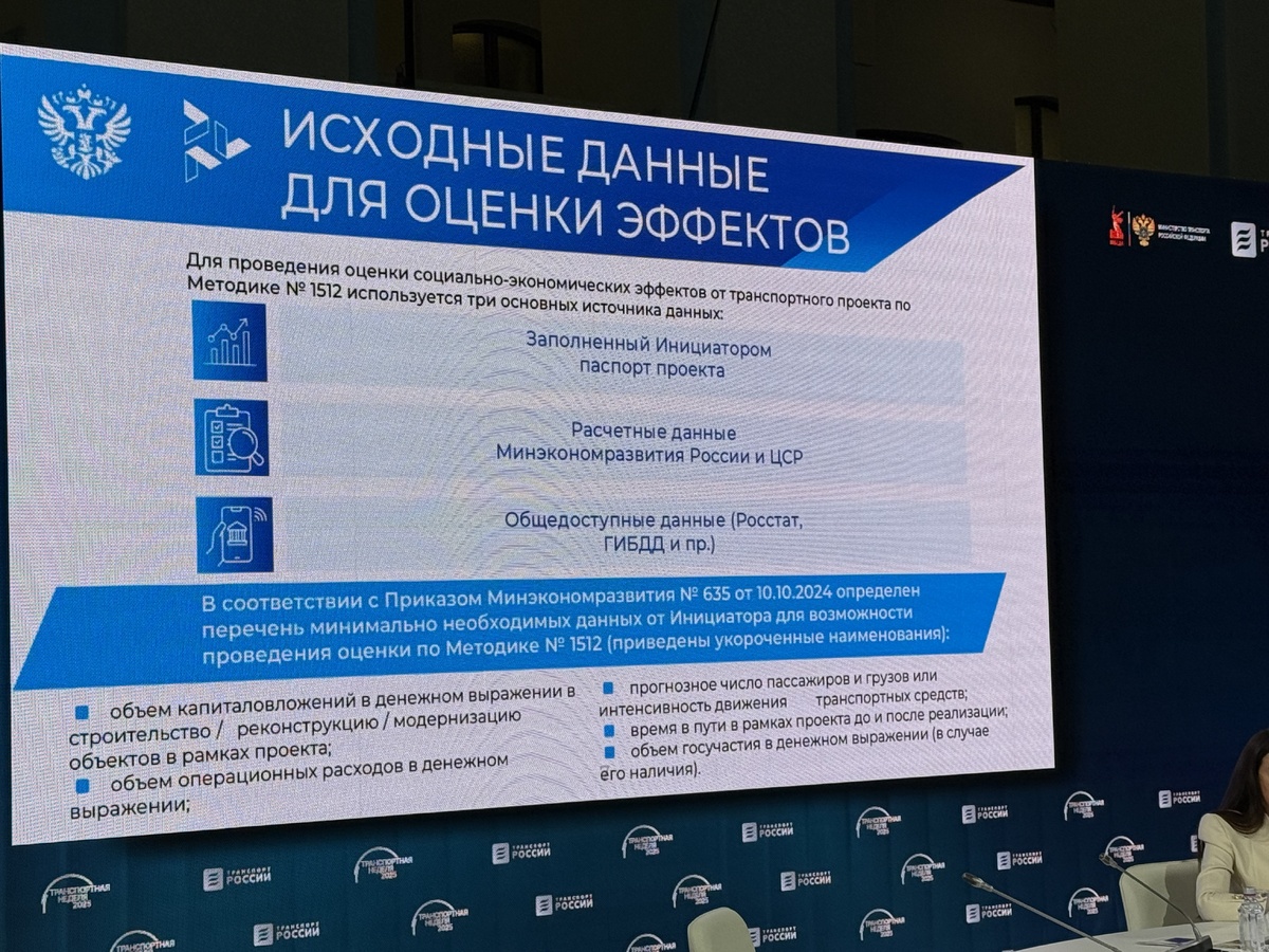 На «Транспортной неделе — 2025» был презентован буклет «Оценка социально-экономических эффектов от транспортных проектов для целей принятия решений о целесообразности их реализации», разъясняющий принципы оценки социально-экономической эффективности транспортных проектов. Центр стратегических разработок и Минэкономразвития России сделали его специально для региональных команд, экспертного сообщества и инвесторов. Для проведения оценки социально-экономических эффектов от транспортного проекта по Методике № 1512 используется три основных источника данных: В буклете представлены формулы эффектов инвестиционного спроса и эффектов от содержания объектов инфраструктуры, эффекты от экономии времени в пути пассажиров, снижения количества ДТП на автодорогах, эффекты от прироста туристического потока. Сейчас оцениваются и сравниваются проекты одного вида транспорта: дороги с дорогами, порты с портами, аэропорты с аэропортами. В буклете мы для каждого эффекта пояснили, для какого вида транспорта