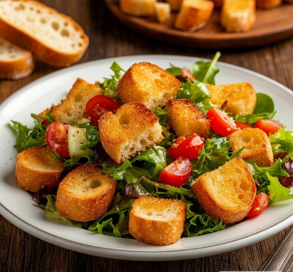САЛАТ — САЛАТ С БАГЕТОМ 🥗 Мяу-мяу, любители хрустящей свежести! 😸 Этот салат с ароматными сухариками из багета — настоящий взрыв вкусов и текстур! 🥖✨ САЛАТ С БАГЕТОМ 🥗 ИНГРЕДИЕНТЫ: 🧾 ·Для салата: · Баттербродный багет или чиабатта — 150-200 г · Помидоры черри — 200 г (или 1 крупный помидор) 🍅 · Огурец — 1 шт. (около 150 г) 🥒 · Сладкий перец — 1 шт. 🌶️ · Красный луковица — ½ шт. (небольшая) 🧅 · Пекинская капуста или салатная смесь (микс) — 150 г · Свежая кинза и петрушка — небольшой пучок каждой 🌿 ·Для заправки: · Оливковое масло Extra Virgin — 4 ст. л. · Лимонный сок — 2 ст. л. 🍋 · Чеснок — 1 зубчик (мелко порубленный или через пресс) · Сахар — ½ ч. л. (чтобы сбалансировать кислоту) · Соль, свежемолотый черный перец — по вкусу · Сушеный орегано — ½ ч. л. ВРЕМЯ ПРИГОТОВЛЕНИЯ: ⏰ 20 минут СЛОЖНОСТЬ:🐾 Проще кошачьей гимнастики! ПОШАГОВЫЙ РЕЦЕПТ: 👩🍳 1. Приготовьте сухарики: Духовку разогрейте до 180°C. Багет нарежьте кубиками примерно 2x2 см. Выложите на сухой противень