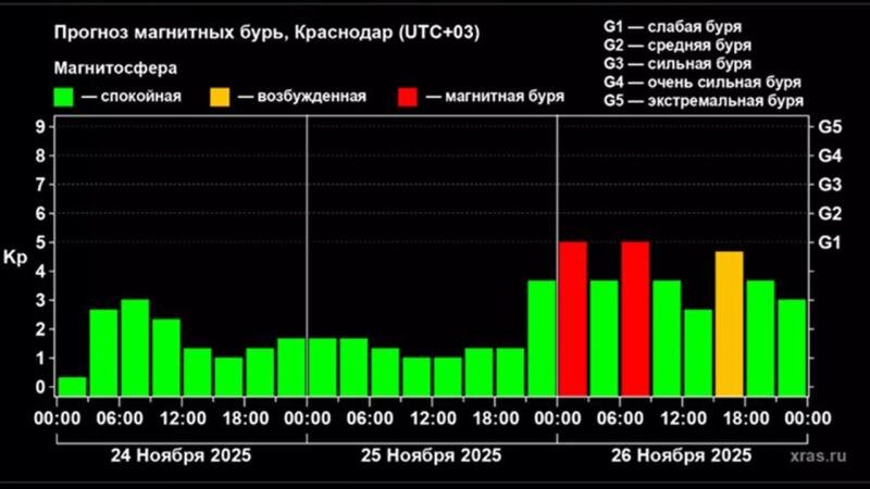 Слабая магнитная буря - уровня G1 - накроет нашу планету до конца этой недели. Она прогнозируется ночью и ранним утром 26 ноября. Ее вероятность составляет 65%. Не исключены геомагнитные возмущения и 25 ноября, сообщает Лаборатория солнечной астрономии ИКИ и ИСЗФ РАН. На Солнце зафиксированы два новых активных центра. В настоящее время они не проявили себя мощными вспышками. Однако ситуация может поменяться в любой момент. Накопив энергию, они могут «стрелять» в сторону Земли, что может привести к магнитным бурям. Напомним, экстремальный взрыв произошел на Солнце 11 ноября: таких событий в зоне влияния на нашу планету не было несколько лет. Ему предшествовали еще два мощных взрыва. Геомагнитный шторм длился 42 часа и стал самым сильным в 2025 году. На пике он усиливался до уровня G4.7. Всего в классификации магнитных бурь пять уровней - от G1 до G5. Ранее портал ЯСНО публиковал предварительный прогноз магнитных бурь на ноябрь этого года. Магнитная буря — это реакция магнитосферы на сил