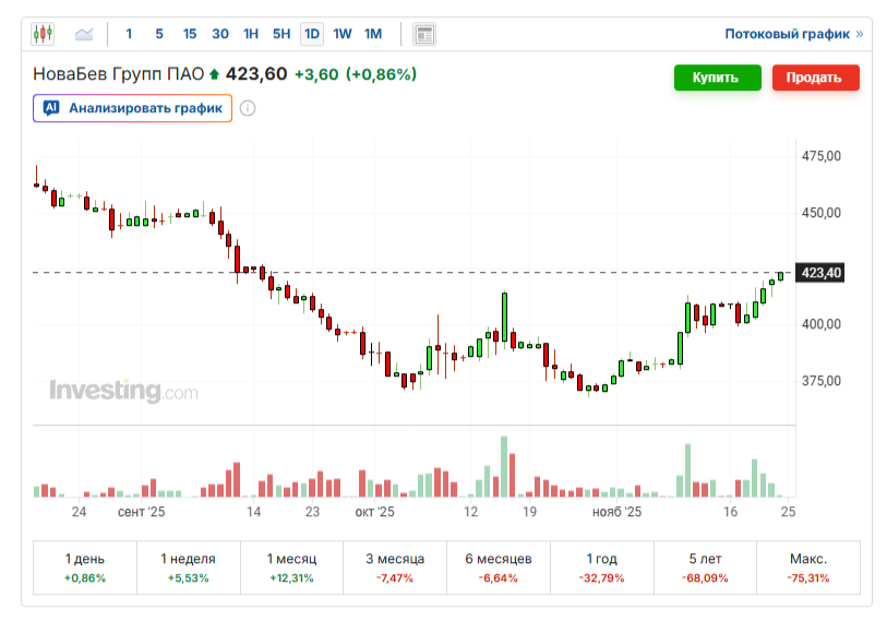 Разберу ситуацию с еще одним эмитентом, которого я активно покупал на падении в сентябре и вообще в этом году - Новабев групп. После сильного падения в сентябре, в октябре акции пытались восстановиться, затем снова снизились до прежних уровней, и уже потом пошли в рост, образовав техническую разворотную фигуру "двойное дно". Побывав на уровнях 370 рублей за акцию, сейчас они поднялись выше 420 рублей за акцию (выросли примерно на 14%) и пока продолжают рост. Также за это время были выплачены дивиденды из расчета 20 рублей на акцию или около 5% биржевой цены. Столь сильное падение этих акций в сентябре, тем более - в преддверии выплаты дивидендов, я считал нелогичным, о чем неоднократно писал, и у меня самого эти бумаги тогда вошли в ТОП-покупок вместе с акциями Европлана. Для меня это еще было важно в связи с необходимостью снизить среднюю цену в портфеле, в течение этого года я снизил ее с 600 до 500 рублей. Почему эти акции падали (как это воспринимал рынок)? Ходили какие-то негативн