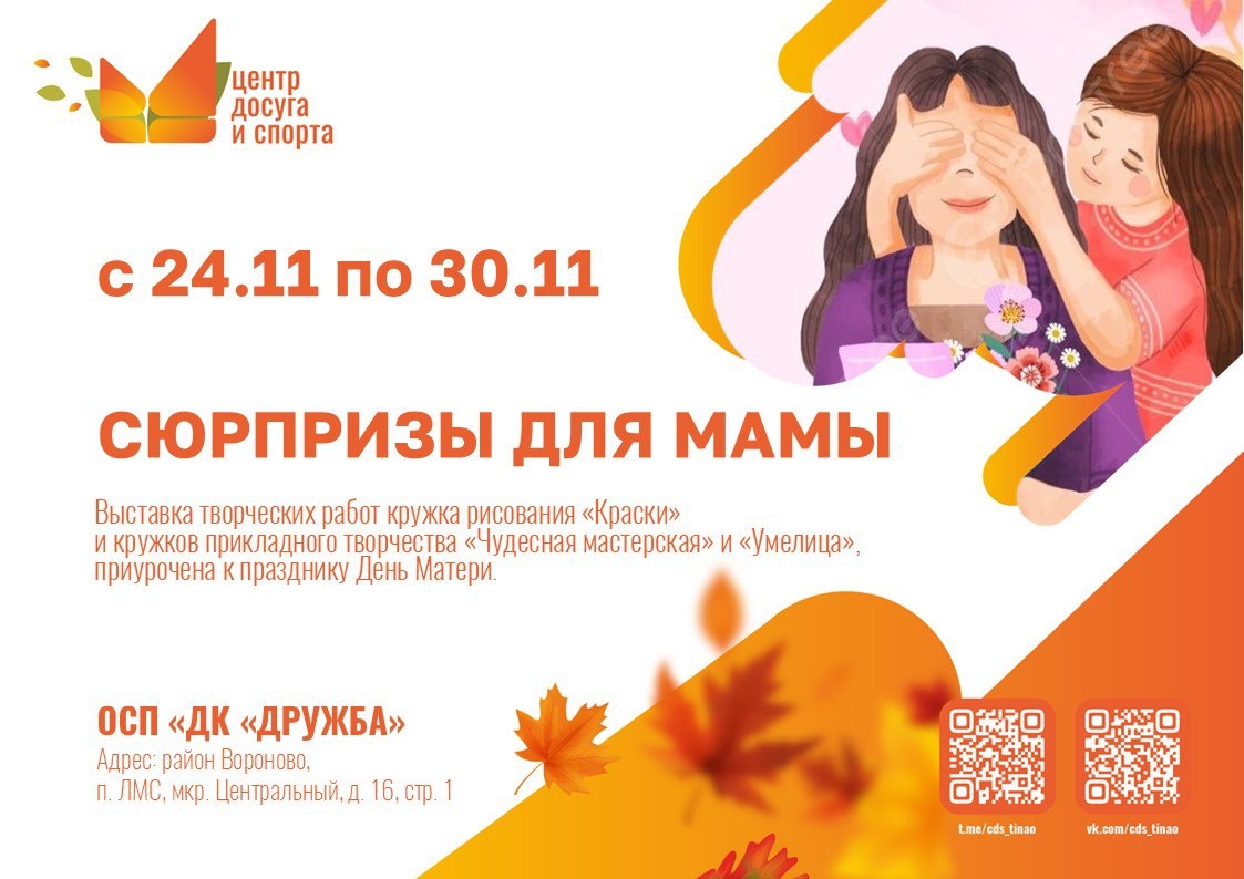Приглашаем всех на выставку творческих работ кружка рисования «Краски» и кружков прикладного творчества «Чудесная мастерская» и «Умелица», посвященную Дню Матери💐 Юные художники и мастера подготовили для любимых мам самые тёплые и искренние подарки-посвящения, сделанные своими руками ❤️ Приходите зарядиться добрыми эмоциями 🤗 #анонсывороново #анонсытинао