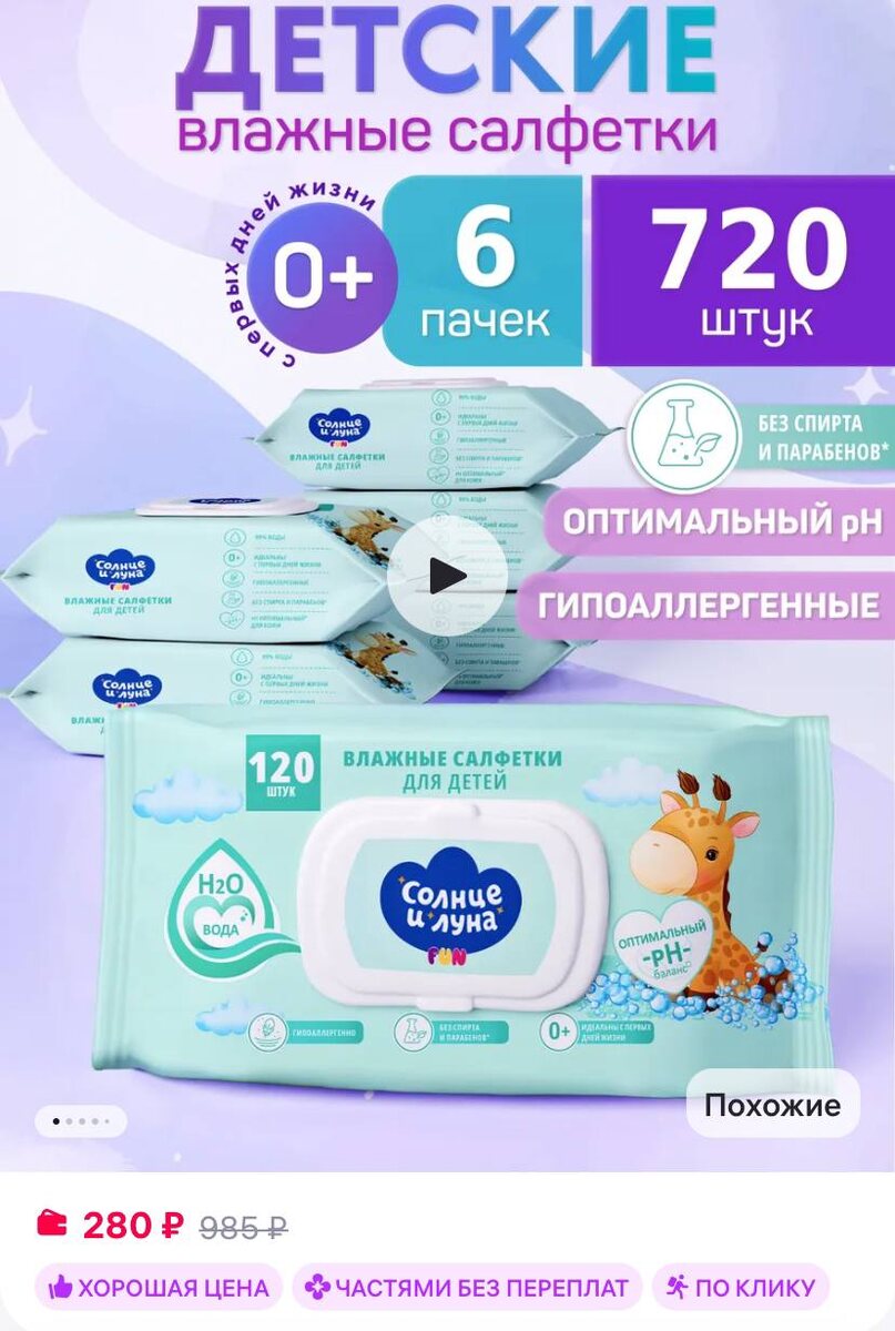СОЛНЦЕ И ЛУНА Влажные детские салфетки 0+ с клапаном