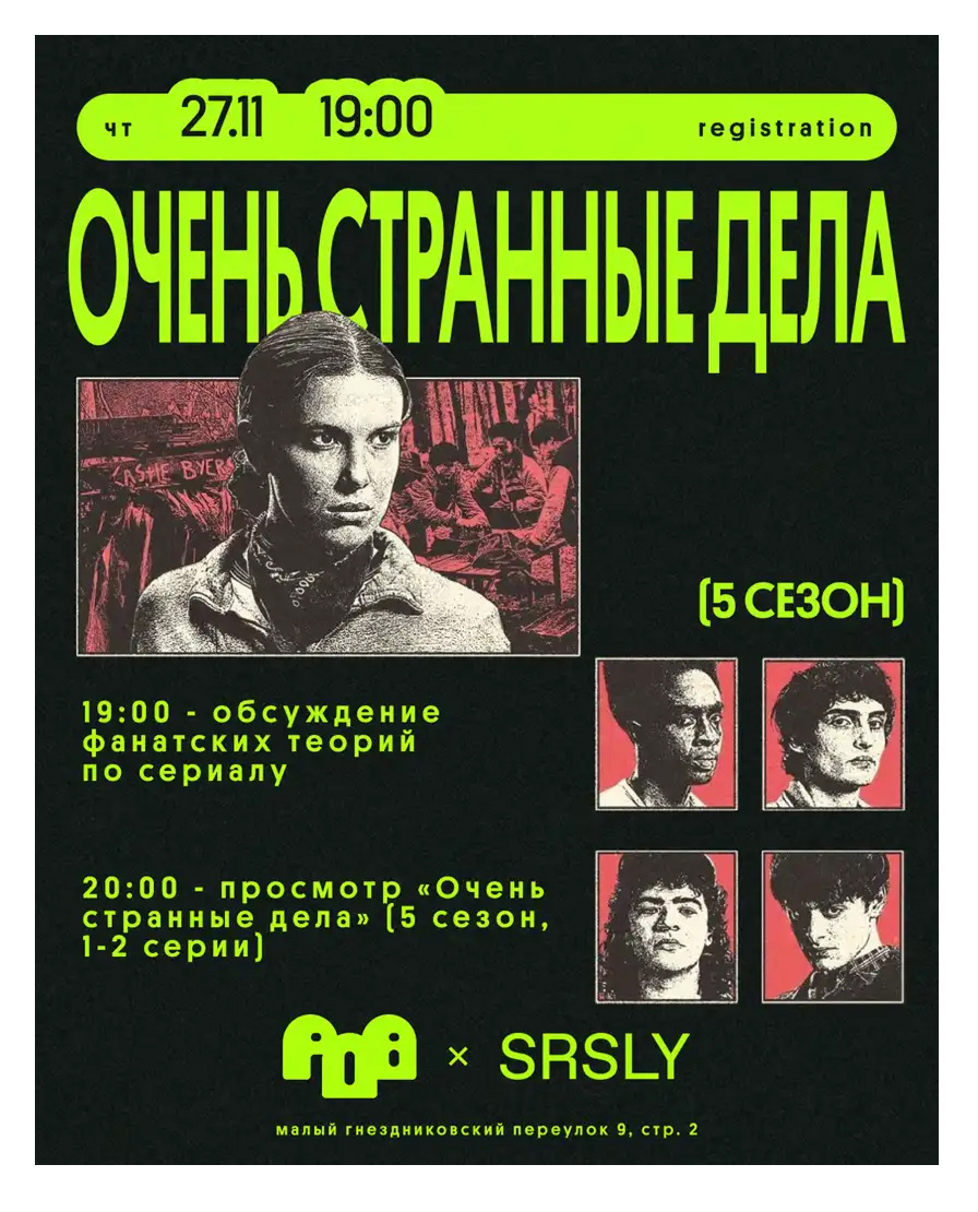 Достаем полосатые футболки в стиле 80-х и включаем в наушниках спасительную Кейт Буш: 27 ноября в московском баре «Ровесник» пройдет ивент, посвященный пятому сезону сериала «Очень странные дела». Сериалу про нердов — нердовская лекция. В 19:00 перед показом нового сезона большая поклонница сериала Вика Доронина расскажет о фанатских теориях вокруг проекта. Например, в сети обсуждают, что в пятой части герои будут путешествовать во времени, а Одиннадцать — дочь Векны. После обсуждения теорий, в 20:00 стартует показ двух серий долгожданного продолжения. Смотреть серии будем в озвучке. Специально к ивенту «Ровесник» сделал тематическое меню. В спешл вошел коктейль по мотивам одного из жутковатых монстров — демогоргона — и вафли с сиропом, любимый десерт Оди. Позиции будут доступны только в день проведения мероприятия. SRSLY подготовил к ивенту печатный кроссворд по сериалу — его можно разгадывать в перерыве между сериями. Экземпляры вы найдете в зале, где пройдет показ, и в других помеще