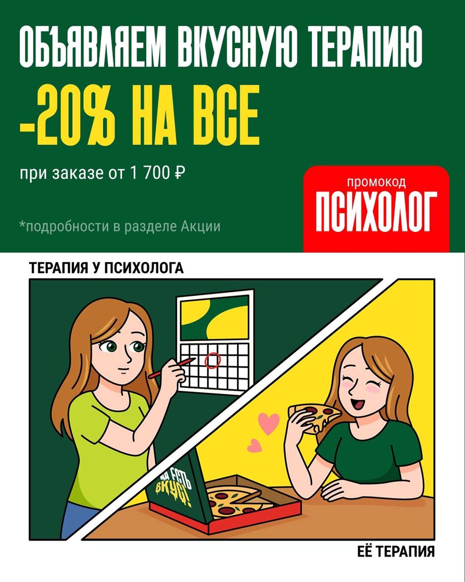 Говорят, лучшая терапия — это разговор по душам 🍃 Иногда вместе с любимой пиццей от Папа Джонс 🍕 Результат гарантирован: ты почувствуешь себя однозначно лучше 😌 Немного заботы о себе никогда не помешает: Сделай заказ от 1700 ₽, введи промокод ПСИХОЛОГ и получи скидку 20% на весь заказ ✨ Потому что забота о себе должна быть вкусной! 💛 papajohns.ru/novosibirsk *срок проведения акции с 24.11 по 27.11