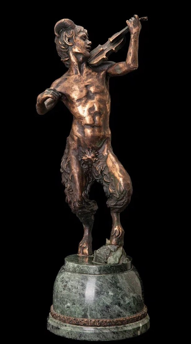 С лицом сатира и щеками, Немножко схожий с хомяками, Под щёку деку положив, Он изготовился, застыв, Как Вакха пьяного статУя; С смычком, где каждый волосок, О плясках конских памятуя, Рванулся б с места, если б мог. ФАВН бронза, постамент индийский мрамор высота 45 см. Упакован. Готов к продаже. #купить