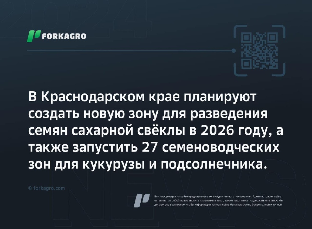 В Краснодарском крае планируют создать новую зону для разведения семян сахарной свёклы в 2026 году, а также запустить 27 семеноводческих зон для кукурузы и подсолнечника. Заместитель губернатора Краснодарского края планирует создать специализированную зону для разведения семян сахарной свёклы к 2026 году. Пока окончательный список мест не утвержден, власти работают над инвентаризацией семеноводческих предприятий и ужесточением контроля над оборотом семян. Также запущено 27 зон для выращивания кукурузы и подсолнечника. Работа этих зон будет обеспечена двумя компаниями. Перейти к источнику