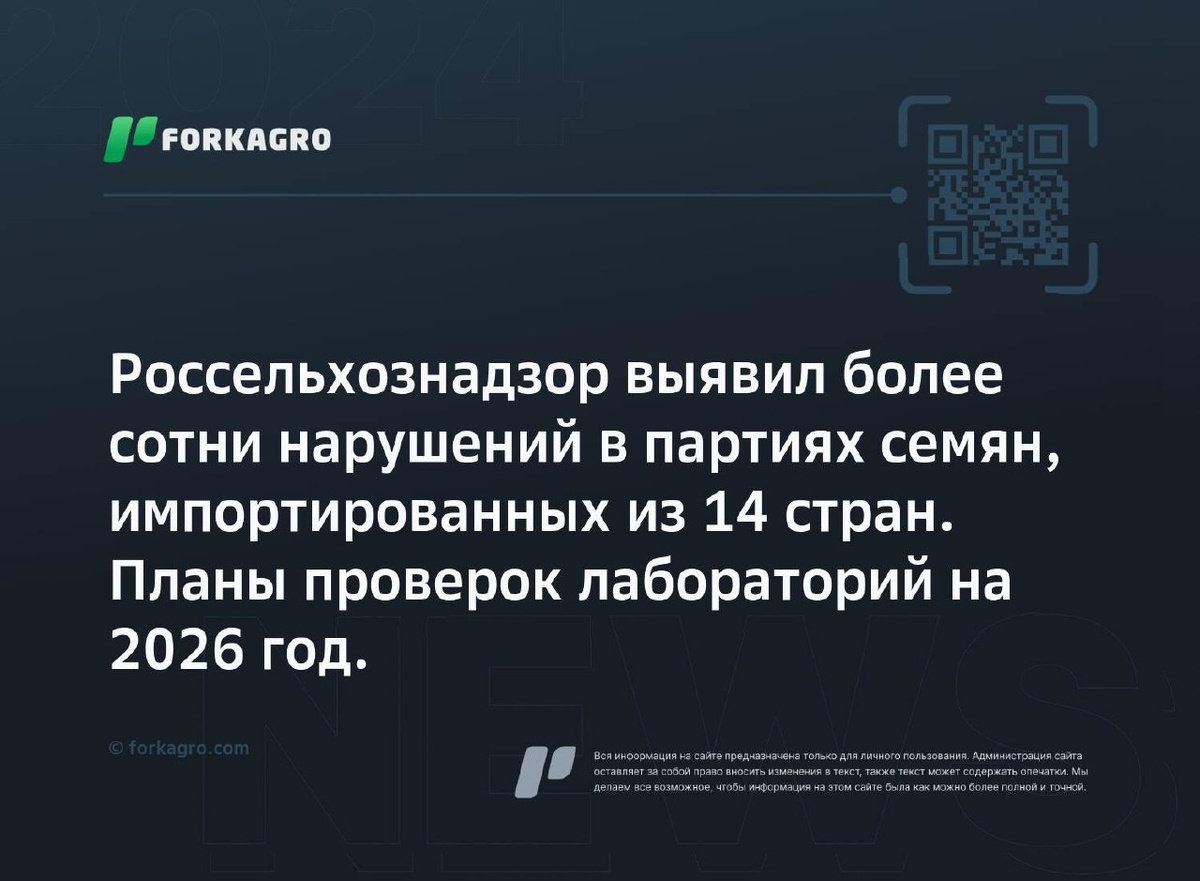 Россельхознадзор выявил более сотни нарушений в партиях семян, импортированных из 14 стран. Планы проверок лабораторий на 2026 год. С начала 2025 года Россельхознадзор выявил более 100 нарушений в партиях семян, импортированных из 14 стран. Они включают в себя ввоз сортов, влияющих на безопасность пищи, несоответствие качеству посевного материала и обнаружение ГМО. Россия ужесточила правила ввоза семян, требуя соответствующие документы. Планируется проверить 32 лаборатории в 9 странах в 2026 году. Нововведения также позволяют иностранным лабораториям самостоятельно подавать заявки на проверку. Россия квотирует импорт семян для увеличения собственного производства посевного материала. Квота на 2025 год сокращена с 33,1 до 18,3 тыс. тонн, а планируется дальнейшее снижение. Перейти к источнику