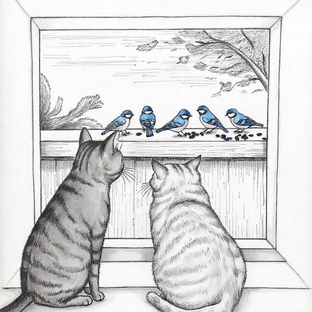 Утром синички снова прилетели к окну — как будто у них там собственный офис. Сокол первым проснулся, увидел их и сделал вид, что он вообще-то только проверяет погоду, а не следит за птицами. Очень важный кот — никакой охоты, только аналитика. Боня появилась следом, увидела «птичьи собрания» и сразу включила режим «вежливого наблюдения». То есть сидела тихо, но хвост так активно подрагивал, что было понятно — дипломатия под угрозой. Синички же чувствовали себя звездами. Одна специально села ближе к стеклу, покосилась на Сокола и как будто сказала: — Привет, пушистый сосед, снова без пропуска? Сокол оскорбился, отвернулся, будто ему вообще всё равно, но уши его выдали — слушал каждое «чирик». Боня в это время вежливо моргала, стараясь не потерять репутацию леди, но когда одна синичка подпрыгнула прямо перед ней, Боня подпрыгнула тоже… и тут же сделала вид, что это был фитнес. В итоге птицы, после того как съели все семечки, улетели по своим важным делам. Боня осталась сидеть у окна,