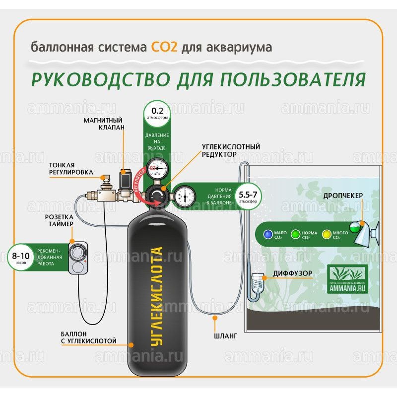🌿 Почему при опустошении баллона CO₂ в аквариум поступает слишком много газа? Когда в баллоне заканчивается CO₂, на диффузор может хлынуть поток пузырей — даже если раньше подача была стабильной. Это приводит к резкому падению pH и гибели рыб. Разберём физику процесса, признаки приближения проблемы и надёжные способы её избежать. ## Что происходит в баллоне на самом деле CO₂ хранится под давлением в жидкой и газообразной фазах. Пока жидкости достаточно, давление внутри баллона остаётся почти постоянным — около 50–60 бар при комнатной температуре. Редуктор выдаёт стабильные 1–2 бара на игольчатый кран. При исчерпании жидкой фазы: - Давление резко снижается. - Остатки газа расширяются и 'вспениваются'. - Подача становится неконтролируемой. В итоге вместо 1–2 пузырей в секунду диффузор выдаёт сотни. Концентрация CO₂ в воде превышает 50–100 мг/л, pH падает ниже 5,5 — рыбы получают отравление. Реальный пример: в 100-литровом аквариуме с одноступенчатым редуктором давление упало с 55