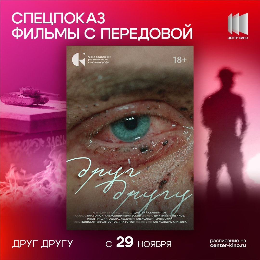 🎥 В рамках проекта «Фильмы с передовой» 🗓 С 29 ноября в кино — фильм «Друг другу» 🔗 Расписание: center-kino.ru Добровольцы и волонтёры ежедневно показывают, что в это непростое время мы как никогда нужны друг другу. Врач-офтальмолог, казак-видеограф, священник, имам и жители маленького села — люди, которые по зову сердца помогают новым регионам России. Обычные граждане становятся героями сегодняшнего дня. Через личные истории великодушных, любящих свою страну людей фильм показывает примеры гражданского патриотизма, силы духа и настоящей доблести.