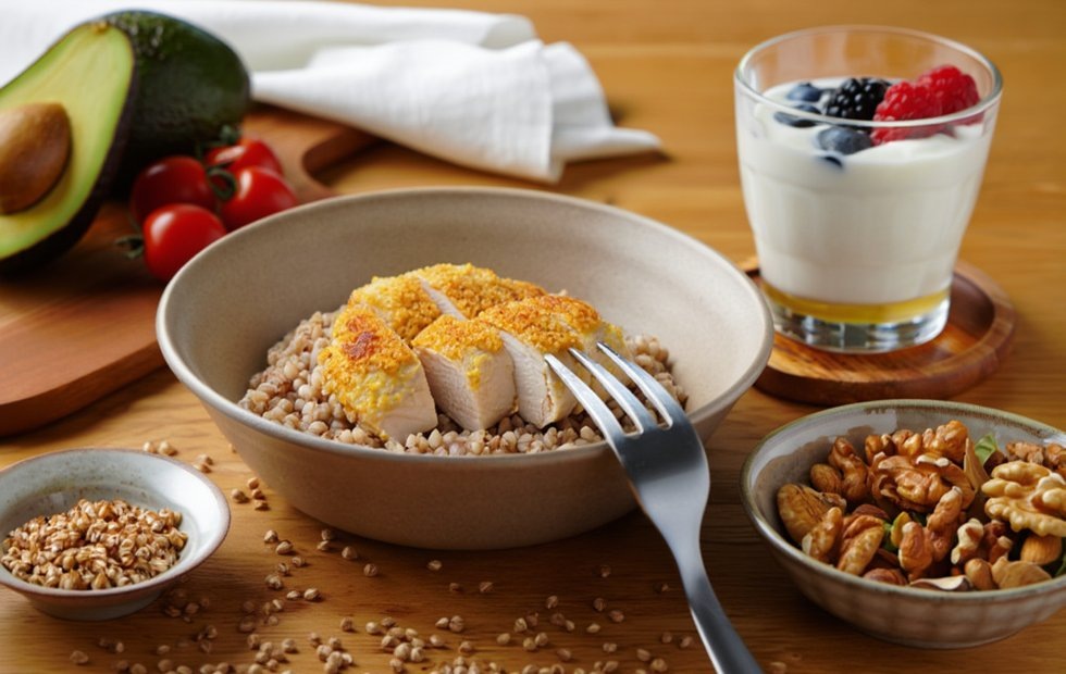 Что делать: считайте белок. В каждый прием пищи включайте белковый продукт: завтрак (яйца, творог, йогурт), обед (курица, рыба, говядина), ужин (рыба, морепродукты, бобовые), перекус (йогурт, орехи, протеиновый батончик). Если не добираете белок из еды, добавьте протеиновый порошок (коктейль на завтрак или перекус, 20-30 г белка на порцию).