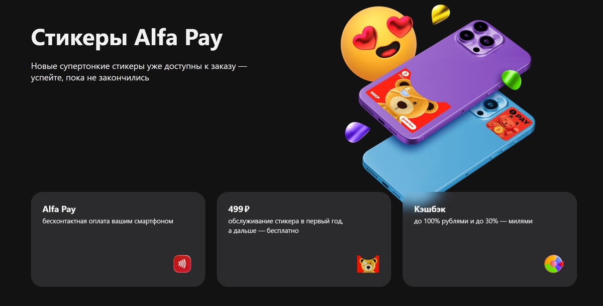 - Стикер привязывается к счёту и карте клиента Альфа-Банка.