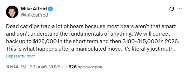 Падения «дохлой кошки» заманивают в ловушку многих «медведей», потому что большинство из них не настолько умны и не понимают основ чего бы то ни было. Мы скорректируемся до $126 000 в краткосрочной перспективе, а затем до $180–315 000 в 2026 году. Вот что происходит после манипуляции. Это буквально просто математика.