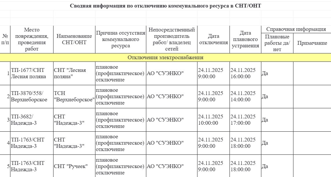 Информация по плановым отключениям в СНТ/ДНТ на 24.11.2025 от ЕДДС города Тюмени