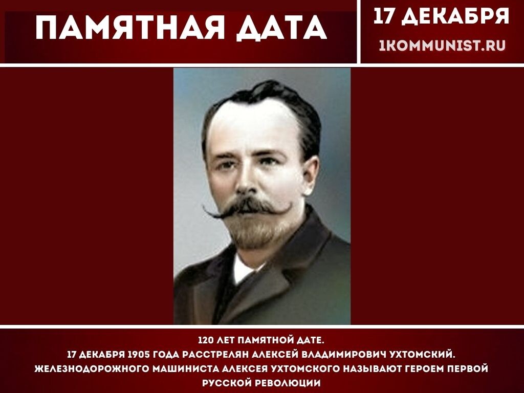 17 декабря 1905 года расстрелян Алексей Владимирович Ухтомский. Железнодорожного машиниста Алексея Ухтомского называют героем первой русской революции Когда 4 декабря 1905 года МК РСДРП принял решение о всеобщей стачке и вооруженной борьбе против самодержавия, он возглавил боевую группу железнодорожников, численностью около 200 человек. Под руководством Ухтомского был оборудован специальный поезд, состоящий из двух вагонов первого класса, двух вагонов второго класса, санитарного вагона и одного вагона-цейхгауза. На нем боевая дружина на участке Москва - Голутвин разоружала полицию, резала провода правительственного телеграфа, задерживала и обезоруживала воинские эшелоны, шедшие из Маньчжурии, устраивала среди солдат митинги, призывая к борьбе с самодержавием. Каждое утро поезд привозил дружину на баррикады, а ночью, оставив на баррикадах дозоры, бойцы Ухтомского уезжали на отдых в Перово или Фаустово. Водили этот поезд Ухтомский и большевик Акулин. 17 декабря 1905 года Ухтомский выехал