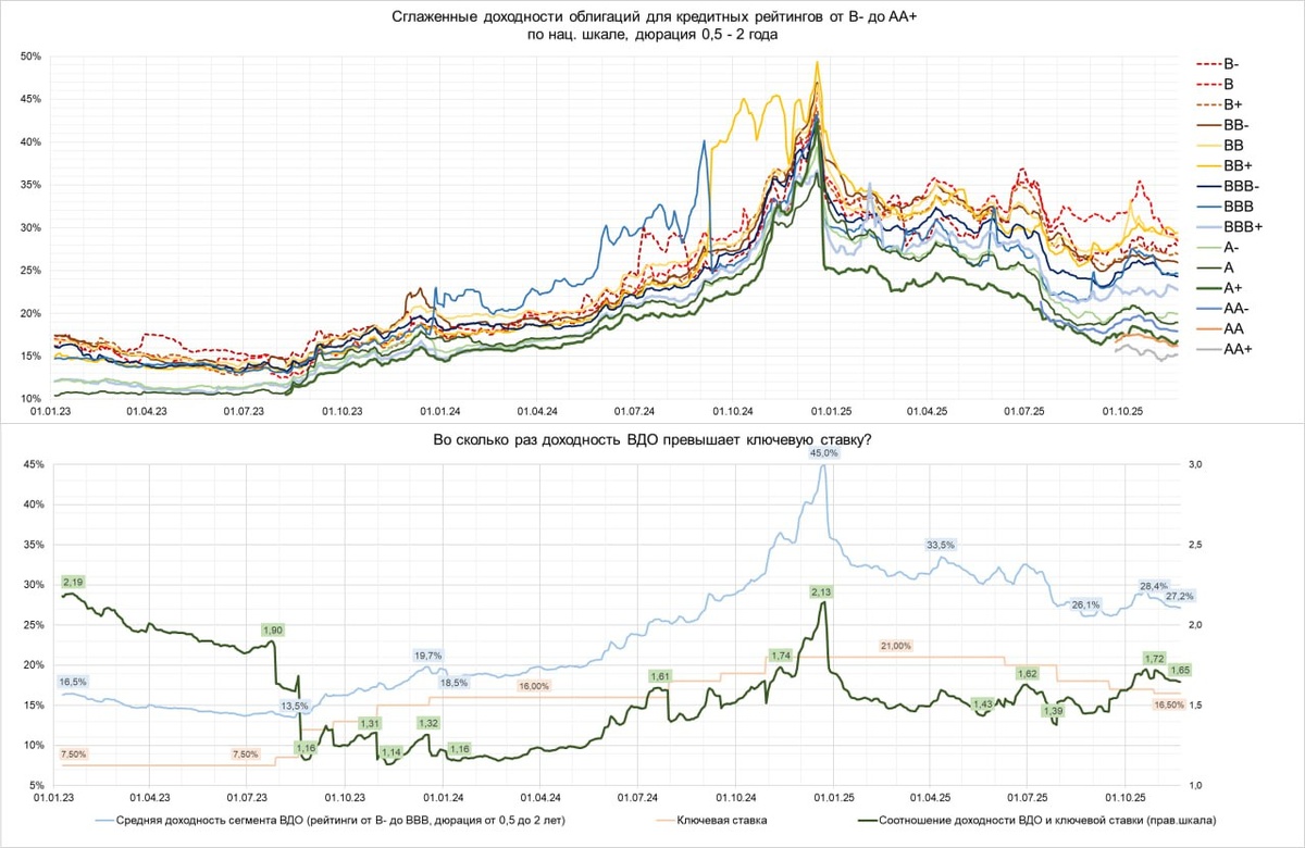 Доходности ВДО медленно снижаются. И остаются очень высокими. Мы применяем не идеальное, но характеризующее рынок соотношение средней доходности ВДО (облигаций с рейтингами от B- до BBB) и ключевой ставки. Недавно его значение поднималось до почти экстремальных 1,72. Сейчас оно ниже, 1,65. Но для последних 2 лет и это много. Тогда как сама средняя доходность ВДО – 27,2%, по нашей оценке. Весьма внушительно. Примерно вдвое выше, чем у длинных ОФЗ. Думаю, несмотря на страхи дефолтов и сами дефолты в нашем сегменте облигаций, его доходности всё же продолжат движение вниз. Более или менее заметное. Учтем, что и годовая инфляция уже ниже 8%. И предположим, что 19 декабря Банк России вновь снизит ключевую ставку. Дополнительный, хоть пока и не гарантированный аргумент. Телеграм: @AndreyHohrin Не является инвестиционной рекомендацией. Ссылка на ограничение ответственности Следите за нашими новостями в удобном формате: Telegram, Youtube, RuTube, Smart-lab, ВКонтакте, Сайт