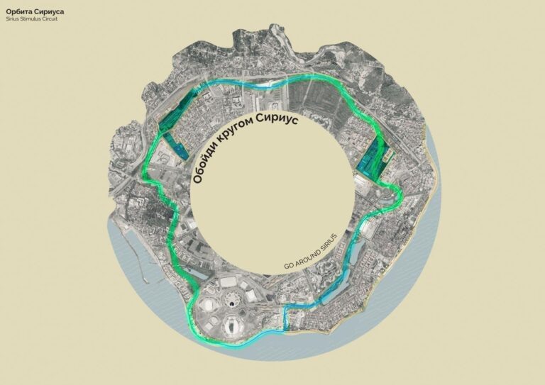 Проблема «Сириуса» — разрозненность. Обширные асфальтовые пространства, слабые пешеходные связи, неиспользуемые зоны. Ответом стала «Орбита Сириуса» — связующая сеть, которая объединяет три крупных узла водно-зелёного каркаса территории: дендропарк «Южные культуры», орнитологический парк и пруды Имеретинской низменности.