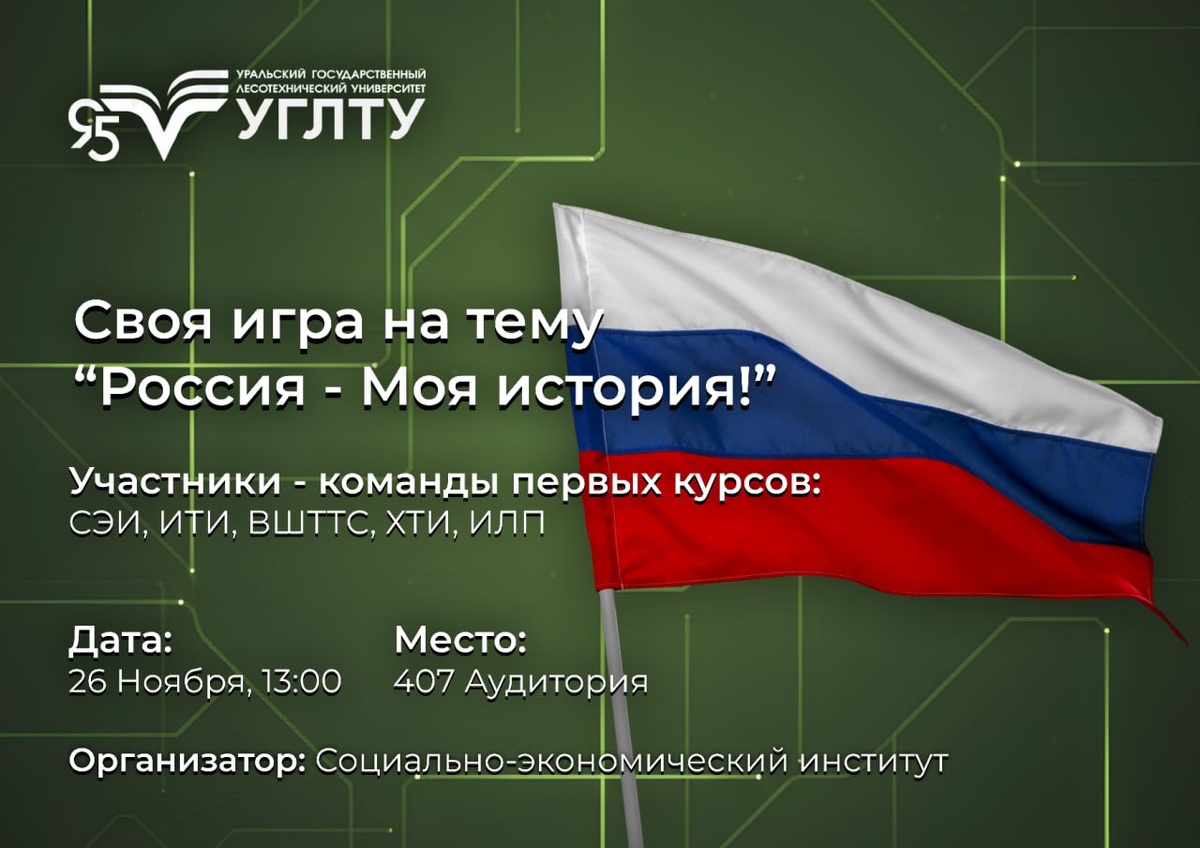 Приглашаем студентов 1-го курса принять участие в интеллектуальной игре "Россия - моя история" с использованием цифровых технологий!📝😉 Вопросы игры будут связаны с политическим устройством государства, географическим положением и историческими фактами о Великой Отечественной войне! 👀 Когда? - 26 ноября в 13:00‼️ Где? - аудитория 407, главный корпус✅ Организатором данного мероприятия выступит Социально-экономический институт! Приглашаем болельщиков поддержать участников игры! Будет азартно, познавательно и интересно!❤️