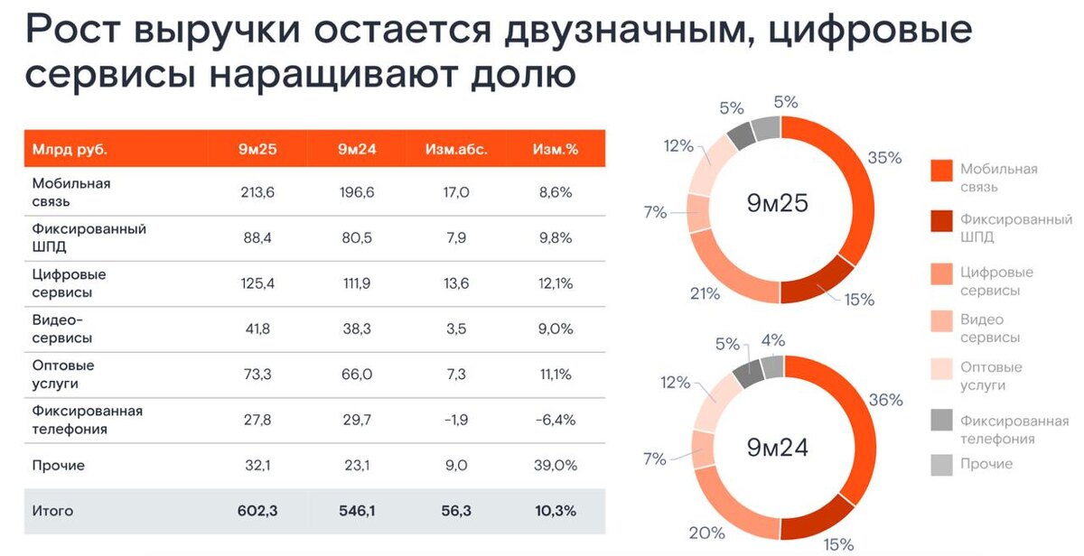 Когда мне в руки попадает отчет российского телеком гиганта, я всегда с опаской посматриваю на процентные расходы, так как они могут, и разрушают, инвест-идею. Сегодня разберем свежий отчет компании за 9 месяцев 2025 года и посмотрим на то, как экономия на налогах позволяет удерживать прибыль. 📱 Итак, выручка Ростелекома за отчетный период выросла на 10,3% до 602,3 млрд рублей. Инфляцию удалось обогнать по динамике, но разве этого достаточно? Сегмент «Мобильной связи» увеличился всего на 8,6%, «Фиксированной ШПД» на 9,8%, а перспективный «Цифровой» кластер на 12,1%. Причем именно он должен расти опережающими темпами в текущих условиях. Как заявила вице-президент Ростелекома Алеся Мамчур, страшный сон российского разработчика - возвращение международных вендоров с бесплатными деньгами, большими IT-командами, качественной разработкой. Вот и получается, что потенциальное снятие санкций в будущем может сыграть злую шутку. 💻 Почему мое внимание приковано к цифровому кластеру? Все дело в е