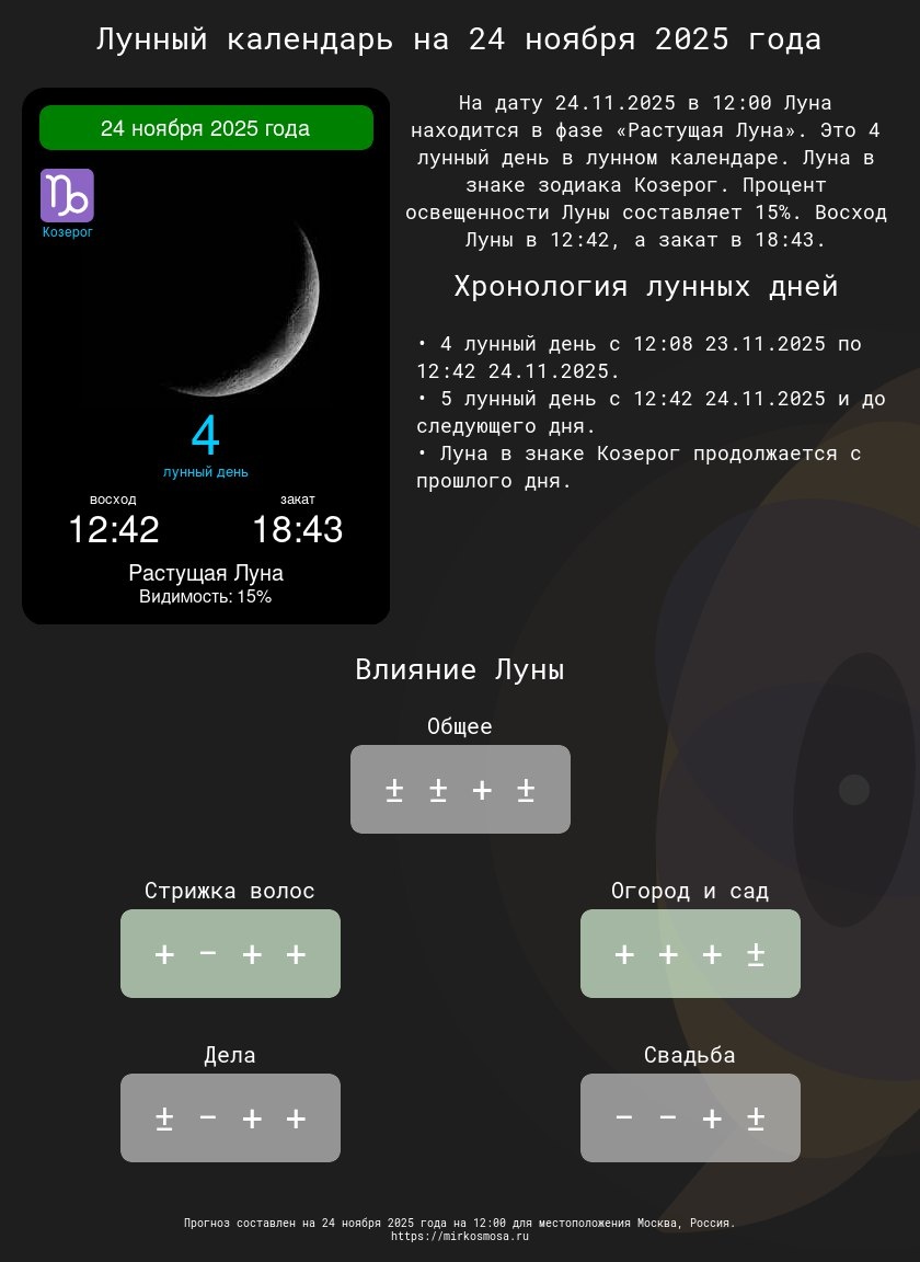 Лунные календари на 24 ноября 2025 года: Подготовьтесь к этому дню с учетом влияния Луны! 🔹🌗 Лунный календарь на 24 ноября 2025 года — Что приготовила Луна? Подробнее 🔹✂️ Лунный календарь стрижек на 24 ноября 2025 года — Подходящий ли день для обновления прически? Подробнее 🔹🌱 Лунный календарь огородника и садовода на 24 ноября 2025 года — Лучшее время для ухода за растениями. Подробнее 🔹📅 Лунный календарь дел на 24 ноября 2025 года — Удачные моменты для важных задач. Подробнее 🔹💍 Лунный календарь свадеб на 24 ноября 2025 года — Подходит ли этот день для вашего торжества? Подробнее