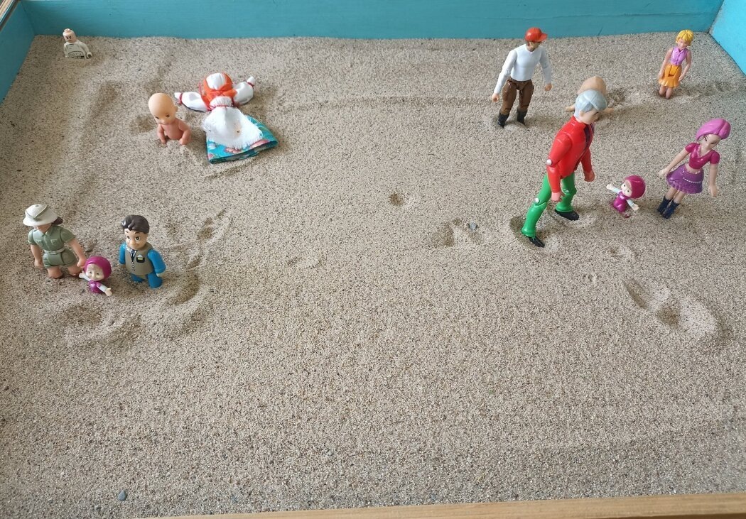 На заднем плане образ родительской семьи. Себя клиентка посадила в виде младенца. Рядом лежит навзничь фигура мамы. В углу слева маленькая фигурка отца.