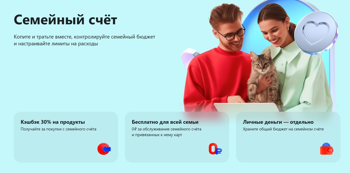 - При совершении покупок с семейного счёта предусмотрен кэшбэк на продукты — до 30% от суммы покупки.