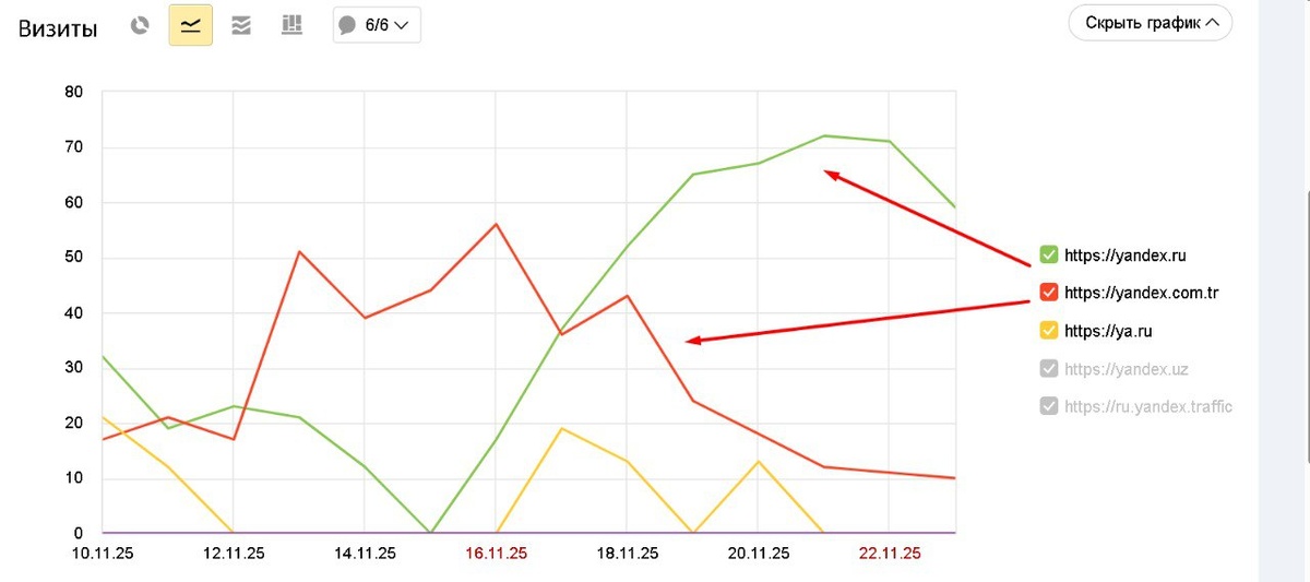Продолжение поста выше... Поддержка Яндекс Карт, как всегда, "на высоте"....Их ответ в духе "так решили алгоритмы" одновременно злит и "заводит". Пришлось порядка 5 раз писать в разные дни, чтобы наконец ситуация выпрямилась с показами карточки организации турецкой аудитории. Уж не знаю, как они колдуют, но точно есть рычаги ) На скрине видно, что заходы с турецкого Яндекс поиска с каждым днем недели уменьшаются. Ну а теперь, что из этого вышло. На карточке у нас запущена Рекламная подписка, которую я совмещала с ПФ, и так, что реклама обучилась на показы на Яндекс Карты, а другие площадки были просто по нулям...Для выпрямления ситуации пришлось остановить ПФ на карточку. Но с приходом на карточку ботов из Турции с площадки Яндекс Поиск, теперь наша реклама переобучилась на Поиск )))...что для нас очень даже не плохо.... В данном случае сработала поговорка "Всё, что ни делается, всё к лучшему" #карты