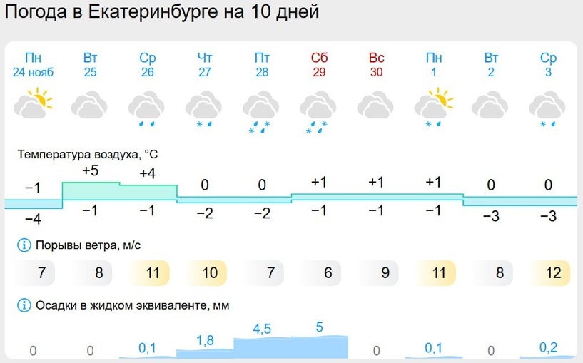 Во вторник, 25 ноября, воздух в городе прогреется до +5, в среду — до +4 градусов. Ночные температуры будут колебаться от −1 до −4 градусов. Количество осадков — дождя и мокрого снега — близко к норме, порядка 5–10 мм за неделю. «Свердловская область будет находиться в теплом секторе циклона, сформировавшегося над Адриатическим морем и поднимающегося на северо-восток, в сторону побережья Баренцева моря Пик потепления в приземном слое атмосферы придется на ночное время, а именно — в ночь на 26 ноября», — объясняет синоптик Алексей Пулин в своем телеграм-канале.