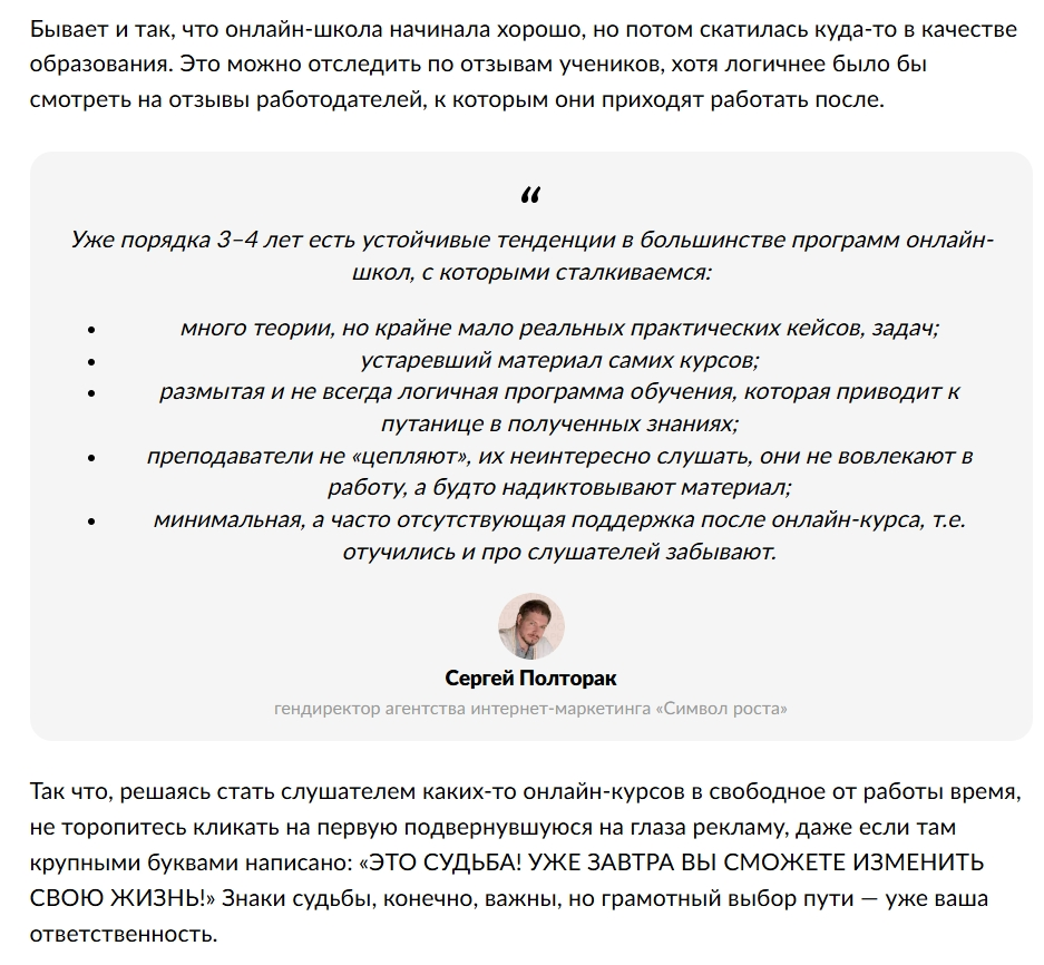 Вышел мой комментарий про риски обучения в онлайн-школах для авторитетного портала Lenta.ru. На самом деле рисков, конечно, больше, но была задача указать на наиболее частые из моей практики. Так что обязательно проверяйте, где и у кого будете обучаться, анализируйте не только программу и отзывы, но собирайте как можно больше информации о самой площадке, преподавателях, навыках и успехах учеников в итоге обучения. И это еще одна важная причина, почему я провожу свои обучающие программы офлайн. Мой комментарий скрином в посте. Ссылка на статью: https://lenta.ru/twz/samorazvitie-kariera/bumazhnye-specialisty-vypusknikam-onlain-shkol-chasto-otkazyvayut-v-rabote-na-chto-im-rasschityvat-v-2026-m.htm Сергей Полторак