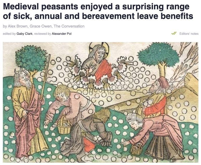 🛌 Устали от офиса? Средневековые крестьяне вам бы посочувствовали. Ученые выяснили неожиданный факт: в XIV веке у них было больше прав на отдых, чем у нас в 2025 году. На английских поместьях действовали правила, о которых современный менеджер может только мечтать. Если крестьянин заболевал, его могли освободить от работы на целый год. Вдовам давали месяц «декрета» после потери мужа, а многочисленные религиозные праздники были священным табу на любой труд. Да, отпускных им не платили. Но и арендную плату с налогами за это время не требовали. Выходит, «темные века» были не такими уж беспросветными для трудоголиков.