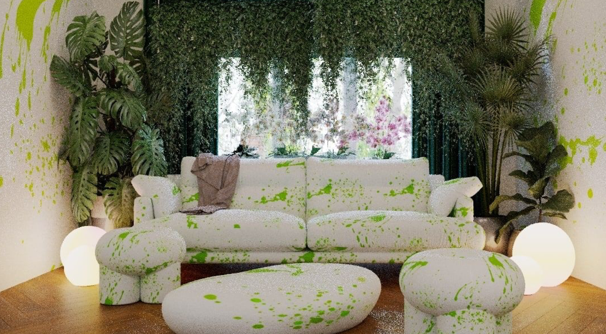 После высыхания дизайнеры обрызгали поверхности зелёной краской, создав единую художественную фактуру.
