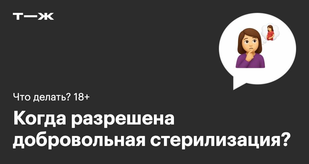 По последним данным Росстата о методах контрацепции, в 2022 году в России провели 15 000 процедур по женской стерилизации. Женская стерилизация — это операция по удалению или перевязке маточных, или фаллопиевых, труб. Это не удаление матки и яичников: органы остаются на месте и продолжают работать. Яичники по-прежнему выделяют гормоны и яйцеклетки, поэтому у женщины сохраняются менструации и свойственный им гормональный фон. Но она будет бесплодна. По закону, чтобы женщина могла сделать стерилизацию по своему желанию, нужно соблюсти одно из трех условий: 1️⃣ Ей больше 35 лет. 2️⃣ У нее двое или больше детей. 3️⃣ У нее есть медицинские показания. Например, беременность угрожает жизни или человек не в состоянии заботиться о детях — допустим, страдает сильной зависимостью. В этом случае операцию могут провести в любом возрасте. К примеру, показанием к стерилизации могут быть туберкулез, тяжелые психические расстройства, инвалидизирующие заболевания нервной, сердечно-сосудистой и кост