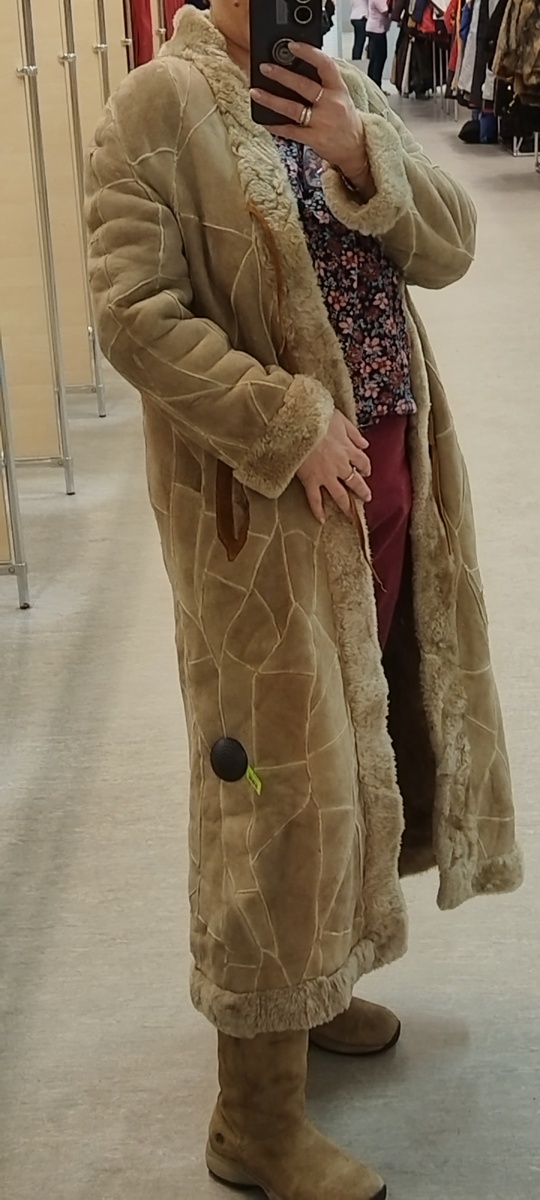На привоз поехать не удалось, поехала в воскресенье. По количеству народа и вялому расхаживанию по залу, поняла, что ловить собственно нечего. Но мы то знаем, что в куче различного товара, всегда равно можно найти что-то интересное. Вот то, что на мой взгляд, мне попалось интересное, Вам и продемонстрирую. 1. Эту дубленку из кусочков я заприметила сразу. В этот раз я изменила "алгоритм" своего передвижения по магазину и рвану к шубам. Так как есть заказы на них. Но! Словно кто-то сглазил. Из шуб ничего интересного. Наверное их раскупают ещё до поступления в наш с/х. В этой накидке- пальто мне понравилось всё!. И крой, и длина, и даже завязочки вместо пуговиц, не понравился размер))) Почистила бы, и носила с удовольствием! Но увы и ах! Дубленка даже цвета была под мои сапоги! Интересная вещь, но жаль, оказалась не моей. А цена то, цена! 1500₽. 2. Облегченный пуховик, "без роду, без племени". 5000₽😳 3.И ещё один пуховичек темно-карамельного цвета. 4. В этот раз попался мужской пухо