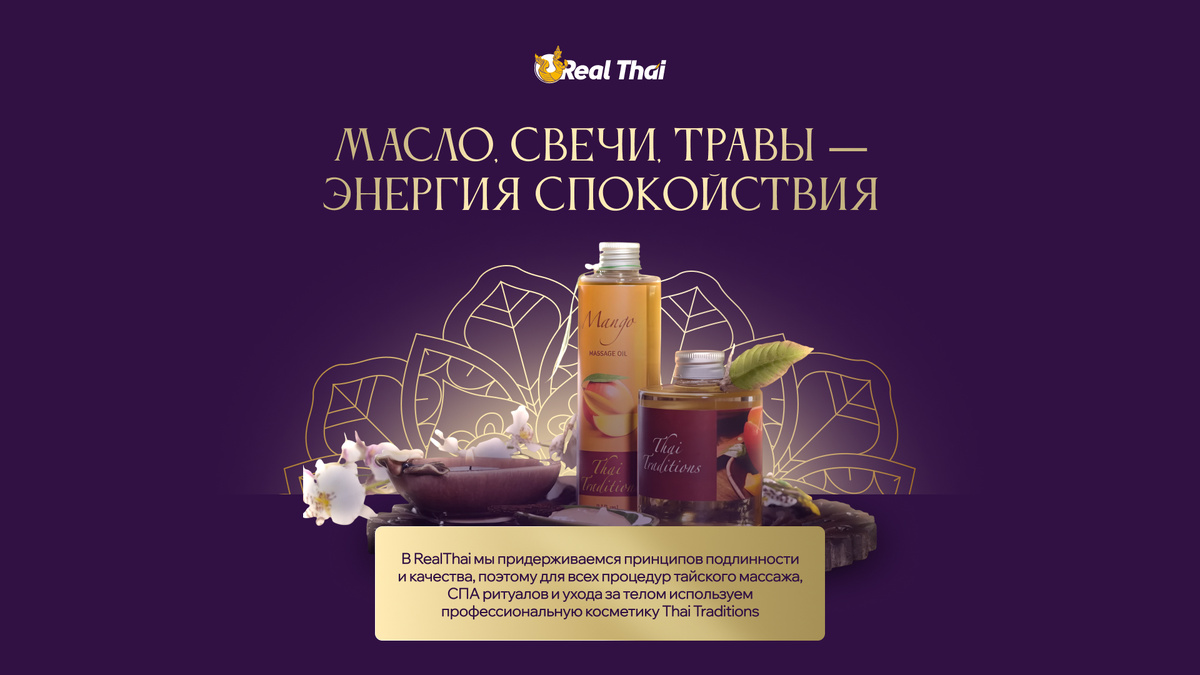 В RealThai мы уверены, что настоящий тайский массаж — это не только техника, но и атмосфера. Для создания идеального расслабления мы используем профессиональную косметику Thai Traditions, которая придает каждой процедуре подлинность и обеспечивает максимальное удовлетворение. 1. Аутентичность из Таиланда