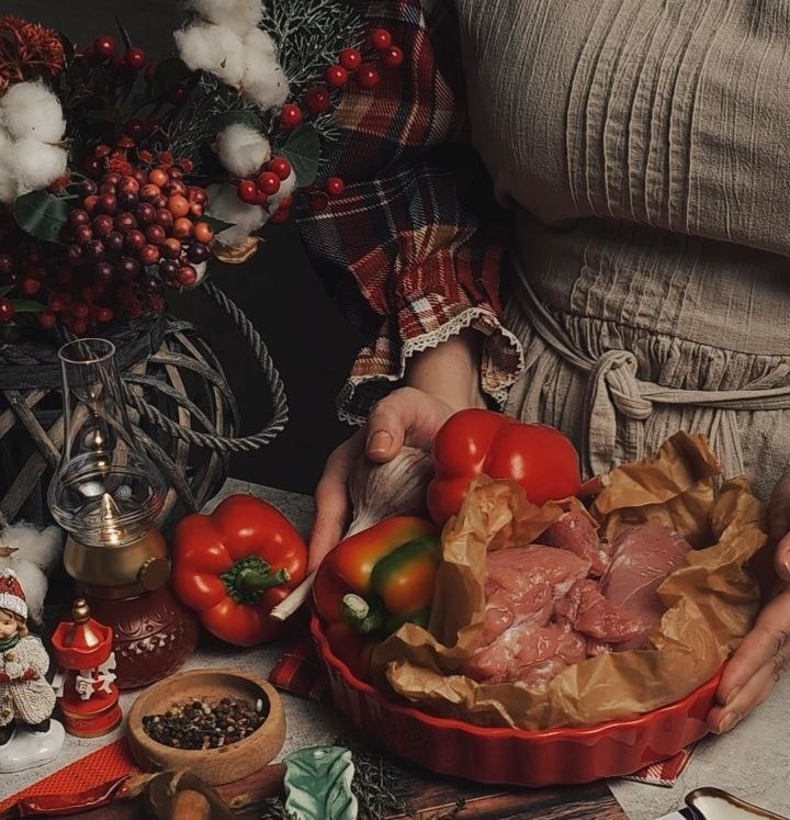 Бывают блюда, которые не просто готовят. Их создают, как создают праздничное настроение — с трепетом и предвкушением чуда. Это маленький спектакль на вашей тарелке, где главные роли играют хруст, аромат и вкус. Хрустящий слоёный конвертик, а внутри — нежная свинина с перцем и луком в сливочно-сырном соусе. Фишка в ритуале: вы разламываете золотистое тесто, выпуская ароматный пар, и макаете кусочки прямо в горячий соус, после чего берете вилкой небольшое количество мяса, кладете на хрустящее тесто, которое пропиталось соусом и съедаете…. Взрыв вкуса, хруст и нежность. Просто. Вкусно. По-новогоднему. Давайте же приготовим. Нам понадобится: Готовое слоеное тесто разделить на ровные квадратики и испечь до золотистой корочки. Свинину нарезать тонкой соломкой Болгарский перец тоже нарезать тонкой соломкой Свинину обжарить до полуготовности и добавить сначала нарезанный тонкими полукольцами лук, затем перец. Перемешать, обжарить все вместе. Когда мясо и овощи будут готовы натереть пармезан