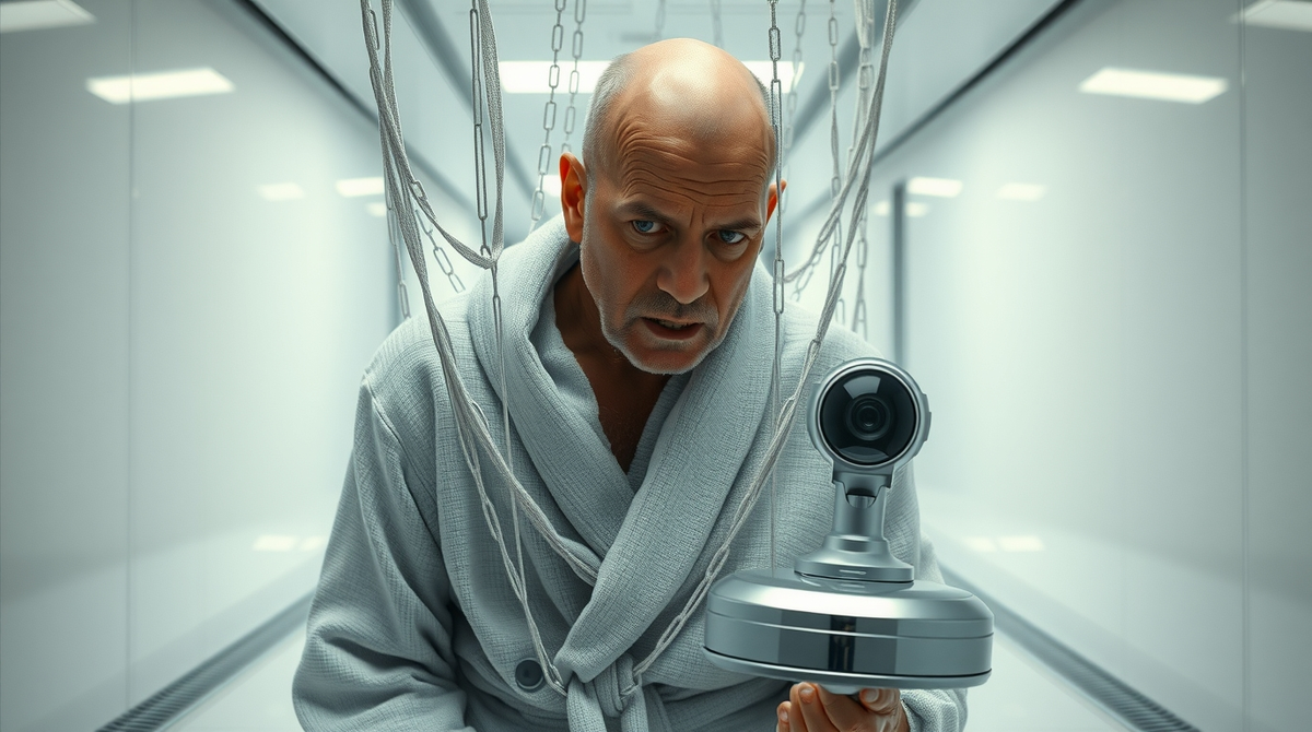 [СЦЕНА: Роскошный, но бездушный особняк. Камеры следят за каждым углом. БРЮС УИЛЛИС в халате сидит перед огромным телевизором. На экране – «Крепкий орешек». Он смотрит пустым взглядом.]