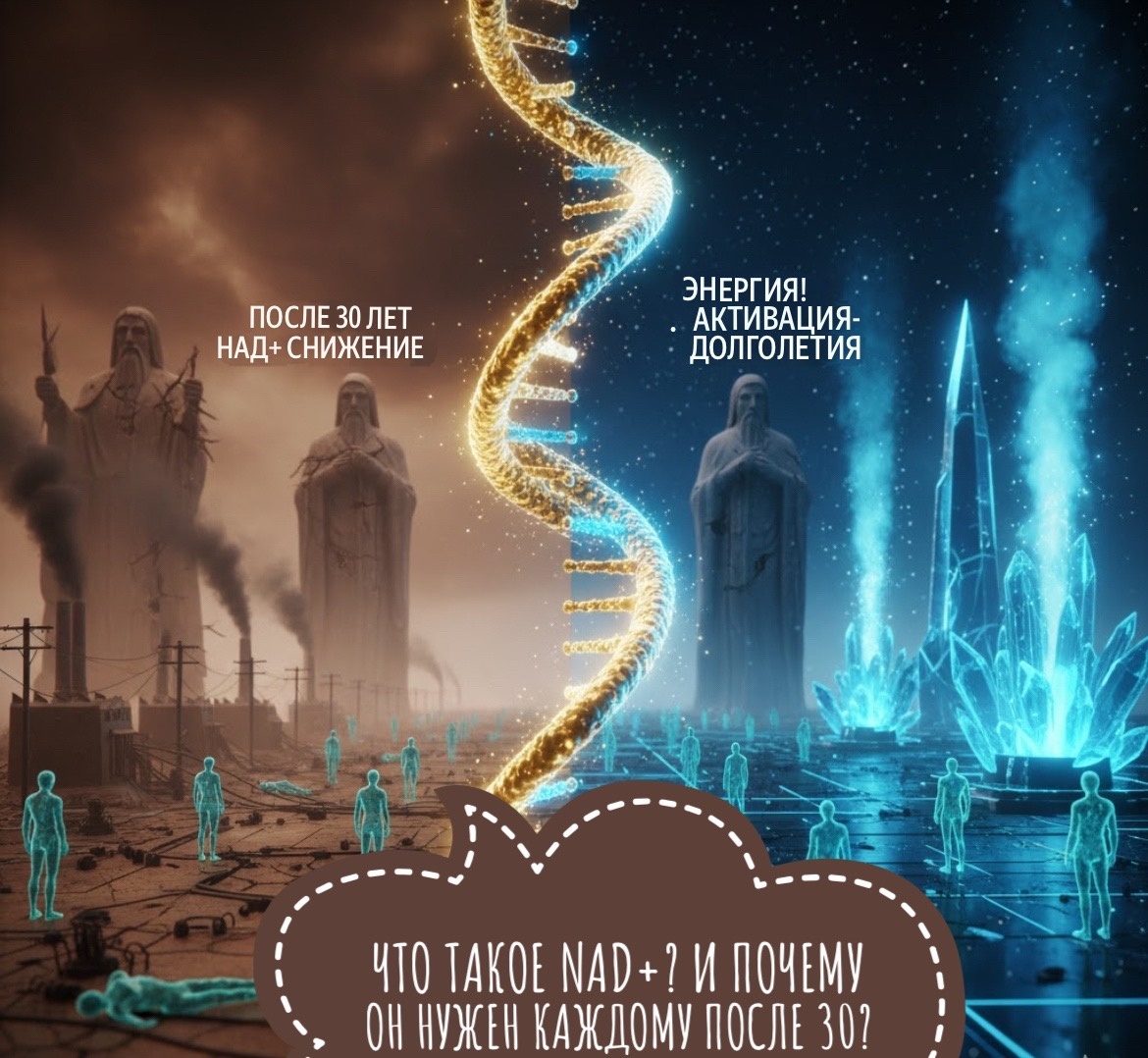 Всем доброго времени суток! 👋 Готовы к погружению в удивительный мир клеточной биохимии, который, на самом деле, является ключом к нашей энергии и молодости? 🤩 Сегодня мы знакомимся с настоящей звездой anti-age медицины - молекулой NAD+! ✨ 🔥 ЧТО ТАКОЕ NAD+ И ПОЧЕМУ ОН ЖИЗНЕННО ВАЖЕН? Представьте себе, что ваши клетки - это маленькие города. 🏙️ В этих городах круглосуточно работают электростанции (митохондрии). А что нужно для работы электростанций? Электричество! 💡 NAD+ (Никотинамидадениндинуклеотид) - это не просто молекула, это ключевой кофермент 🔑, присутствующий в КАЖДОЙ клетке вашего тела. Его главная роль - быть своего рода «электриком» или «перевозчиком энергии». 🚚 ⚡ Генератор энергии: NAD+ необходим для преобразования питательных веществ, которые мы получаем с пищей, в АТФ - ту самую «валюту» энергии, которая питает все процессы: от дыхания до мышления. Без NAD+ митохондрии просто не могут работать эффективно. 🔋 🛡️ Ремонтник ДНК: Эта молекула - нез