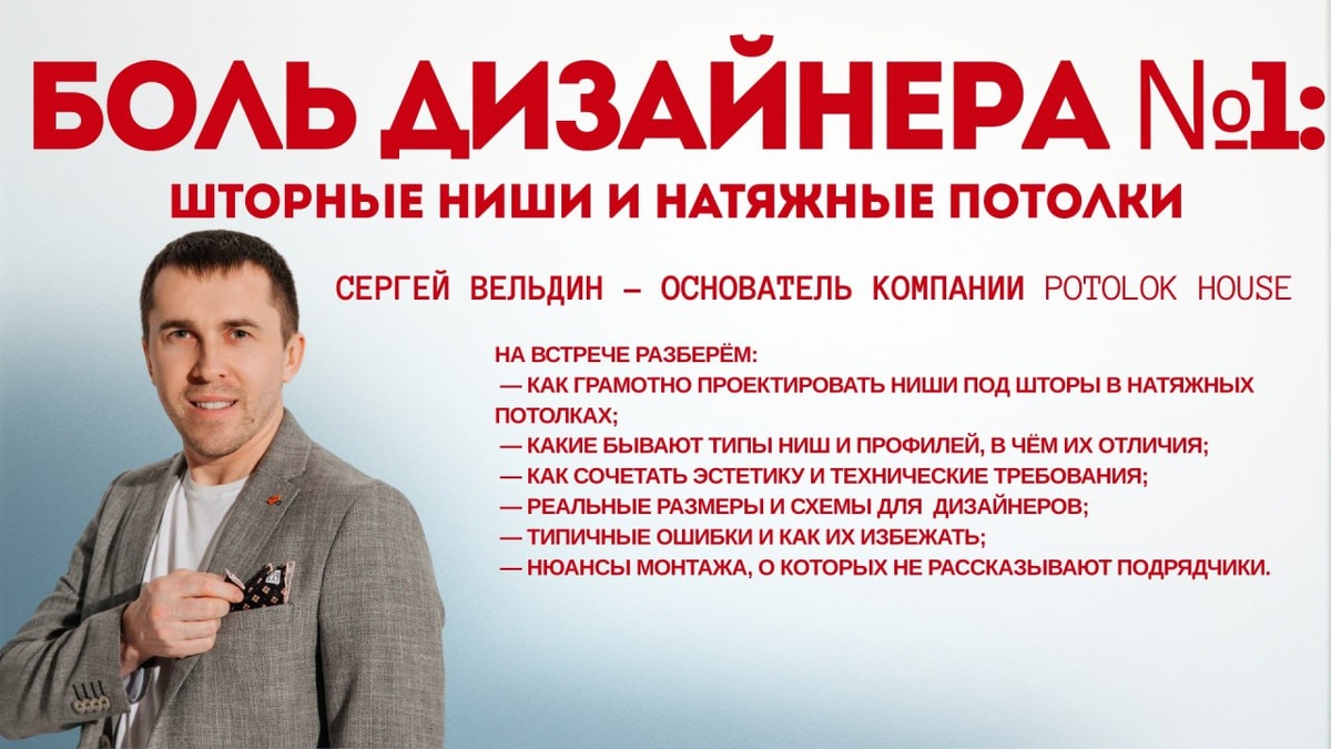 🤍ЛЕКЦИЯ🤍 Боль дизайнера №1️⃣: ниши под шторы и натяжные потолки 🤍Каждый дизайнер хотя бы раз сталкивался с этим кошмаром: идеально продуманный интерьер рушится из-за одной «мелочи» — неправильно запроектированной ниши под шторы. Линии света, парящие потолки, шторные профили — казалось бы, пустяк, а на деле головная боль и бесконечные исправления. На этой встрече вы получите: ✨Пошаговый разбор: как проектировать ниши под шторы и парящие профили без ошибок ✨Все варианты ниш и профилей: чтобы знать, что выбрать для любого интерьера ✨Эстетика + техника: как совместить красоту и функциональность ✨Реальные размеры и схемы: гайд для дизайнеров, чтобы сразу внедрять в проекты ✨Типичные ошибки: и как их избегать ✨Секреты монтажа, о которых подрядчики обычно молчат 💡 Практическая встреча, после которой вы сможете: - говорить с подрядчиками на одном языке -избегать переделок -экономить время и нервы 🔝Спикер: Сергей Вельдин, основатель Potolok House 🗓Дата: 1 декабря | 🕑 15:00–17:00 📍М