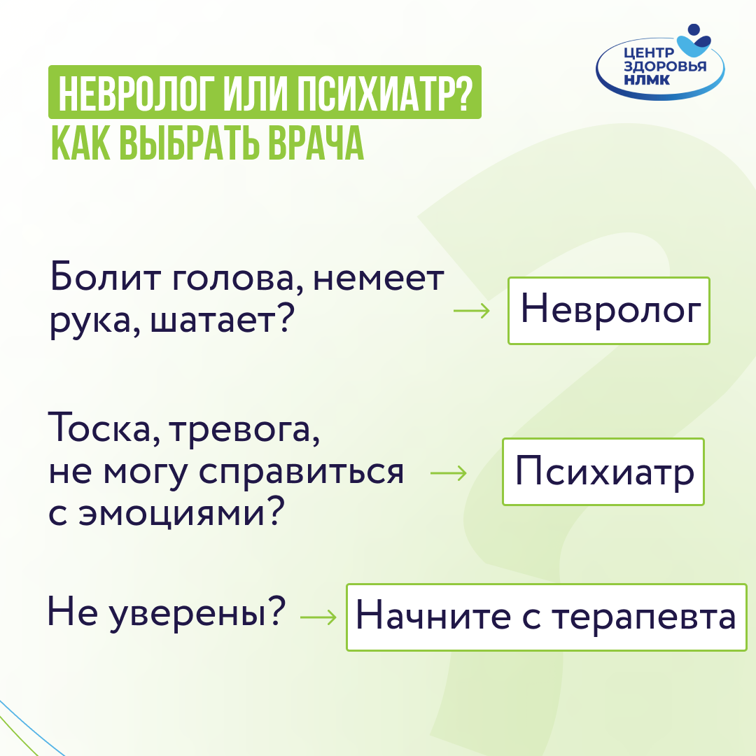 Голова болит от перенапряжения или от тревоги? Слабость в руках — это проблема с нервной системой или последствие депрессии? Чтобы было проще, мы сделали для вас понятную шпаргалку. Если сомневаетесь, сначала запишитесь к врачу общей практики или терапевту. Он посмотрит на ваши симптомы со стороны и даст направление к нужному специалисту. В Центре здоровья НЛМК можно получить помощь квалифицированных врачей. Запись по телефону: +7 (4742) 55-55-43 Режим работы Единого центра сопровождения: Пн–Пт: 7:30 – 21:00 Сб: 8:00 – 20:00 Вс: 8:00 – 17:00 *Имеются противопоказания, необходима консультация специалистов. #ЦентрЗдоровья_НЛМК