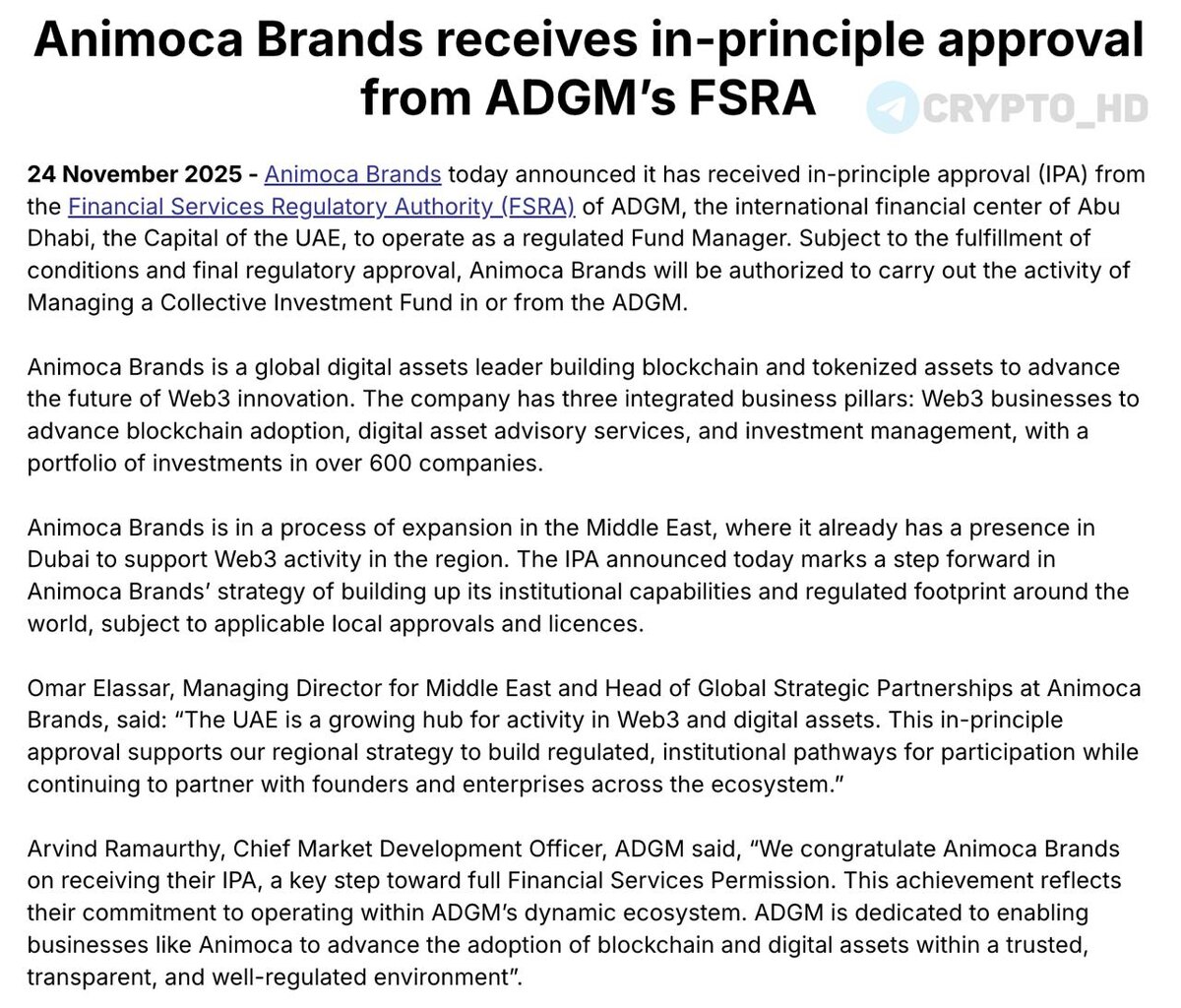 #moca 🇦🇪 Animoca Brands расширяется на Ближнем Востоке. Компания получила принципиальное одобрение от финансового регулятора Абу-Даби (FSRA ADGM) для работы как регулируемый управляющий фондом. Следующий шаг – финальная лицензия. После ее получения Animoca Brands сможет управлять фондами, привлекать институционалов и запускать регулируемые инвестиционные продукты в регионе. Ранее: - возвращается на биржу - токенизирует акции - готовятся к IPO Crypto Headlines