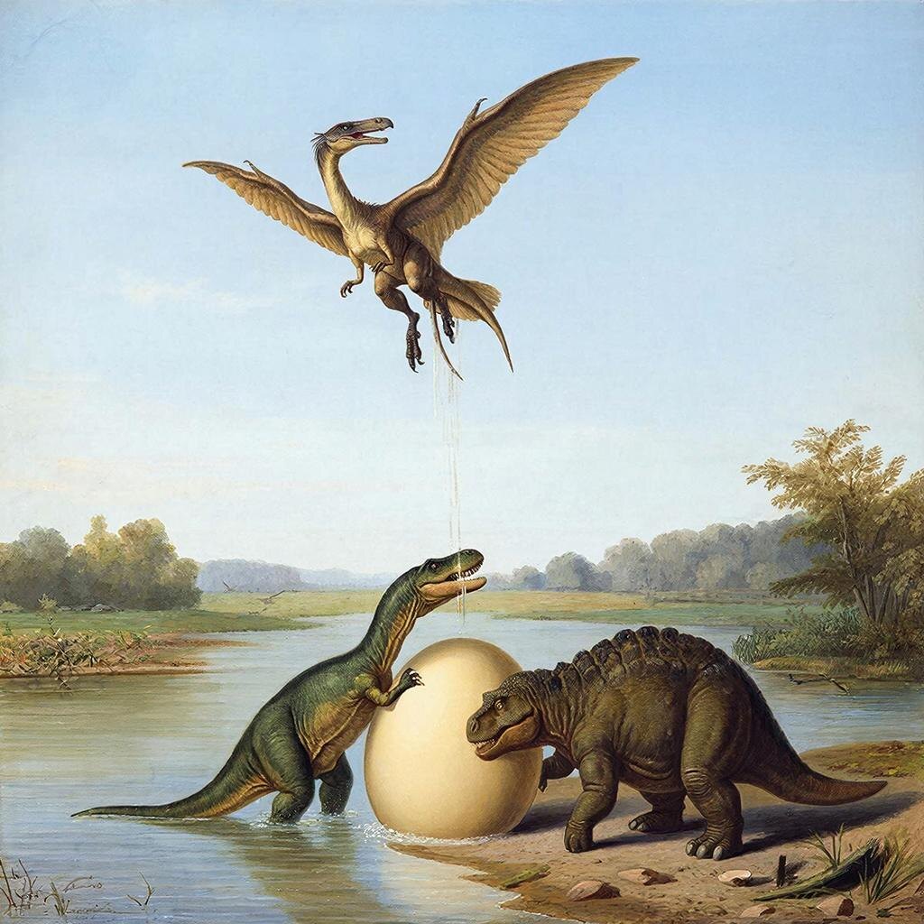 басня И. А. Крылова "Лебедь, Рак и Щука", переосмысленная в мире динозавров.