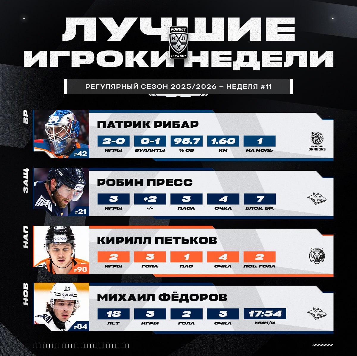 Привет, друзья! На 11-й неделе хоккейного сезона в КХЛ были определены лучшие игроки в разных амплуа. Патрик Рибар из «Шанхайских Драконов» был признан лучшим вратарём, продемонстрировав впечатляющие результаты с коэффициентом надёжности 1,6 и двумя победами в трёх матчах. Робин Пресс из «Металлурга» стал лучшим защитником, набрав 4 очка (1 гол + 3 передачи) в трёх матчах. Кирилл Петьков из «Амура» был признан лучшим нападающим, набрав 4 очка (3 гола + 1 передача) в двух играх. Особого внимания заслуживает Михаил Фёдоров из «Металлурга», который был признан лучшим новичком недели. Набрав 3 очка (2 гола + 1 передача) в трёх матчах, Фёдоров продемонстрировал не только высокую результативность, но и способность адаптироваться к уровню КХЛ. Это говорит о том, что молодой игрок быстро осваивается в лиге и готов конкурировать с более опытными хоккеистами. Такие достижения не только радуют болельщиков, но и подчёркивают уровень конкуренции в КХЛ. Каждый из лучших игроков этой недели внёс свой