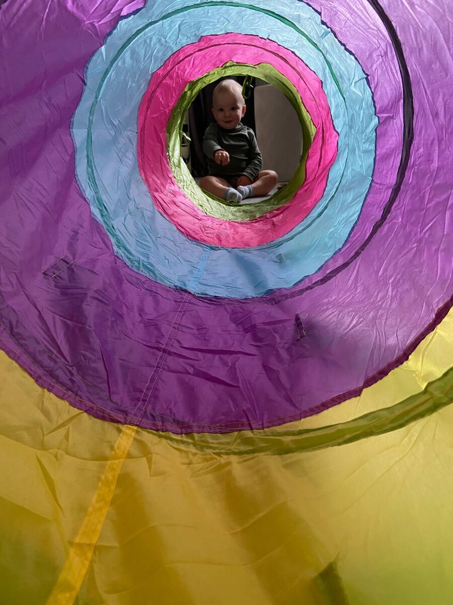 Тоннель для малышей Давно не выступала как физрук.😁 Игры с тоннелем возможны ~с 6 мес, как малыш более-менее уверенно ползает. Вариантов тоннелей множество, преимуществ тоже: ✔️ невесомые, компактные, с разной расцветкой и рисунками (у Мирона в виде гусенички со смешной мордой — заставкой и лапками), недорогие, лёгкие в уходе (протираются влажной салфеткой); ✔️ малыш упражняется в ползании на четвереньках или по-пластунски, но не просто на полу/ковре, а в тоннеле — детям такие игры очень нравятся, и малышам, и постарше (даже после 3-х лет); ✔️стимулирует вестибулярный аппарат — малыш учится координировать движения, балансировать; ✔️ развивает крупную моторику, ориентировку в пространстве — поначалу малыш может противиться/опасаться, но если пролезть перед ним или прокатить мячик/любимую игрушку, заинтересовать, он попробует и будет упражняться в пролезании через тоннель. ✔️ укрепляет детско-родительские отношения, если малыш играет с родителями и развивает социальные навыки. ✔️