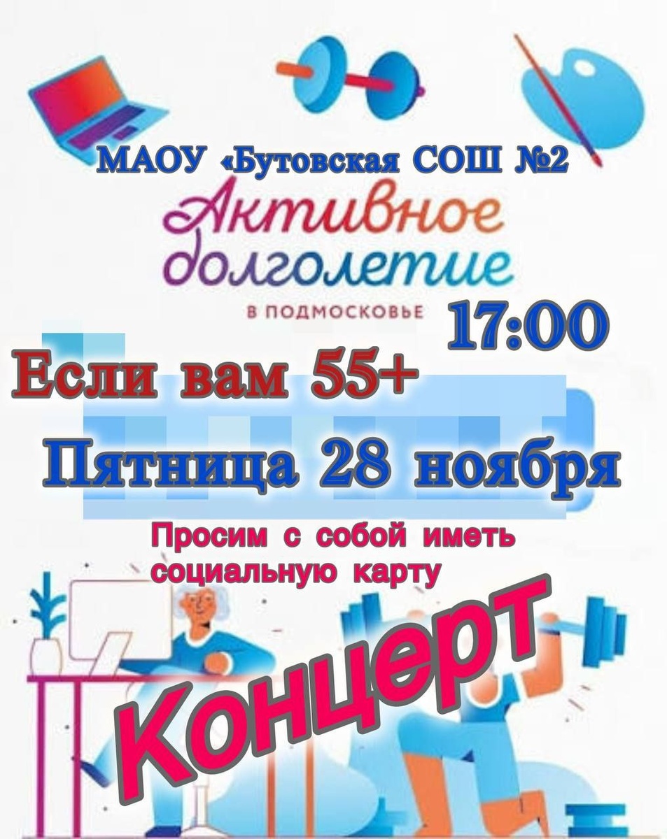 Дорогие жители Ленинского г.о. Мы для вас подготовили удивительный концерт в рамках проекта «Активное долголетие»!!! Если вам 55+ лет, то ждем вас 28 ноября в 17:00 по адресу: пгт Дрожжино, ул. Южная, д.25, к.1. С собой необходимо иметь СОЦИАЛЬНУЮ КАРТУ жителя Ленинского г.о.!!! Давайте все вместе насладимся концертными номерами, которые специально для вас подготовили обучающиеся МАОУ «Бутовская СОШ №2» 🚀Подпишись на Telegram канал Дрожжино