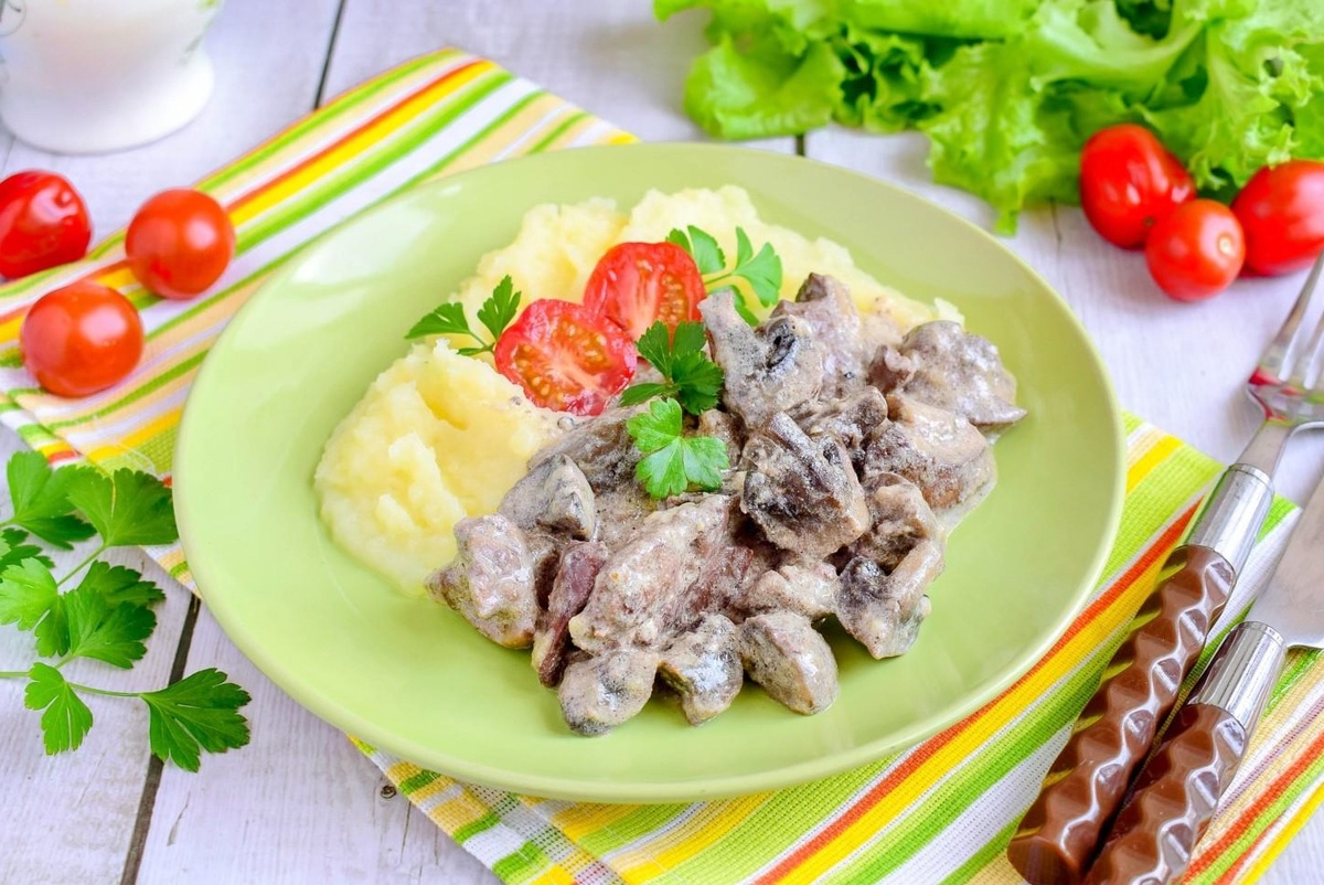 Куриная печень, тушенная в сметане с луком. Классика, которая не подведет.