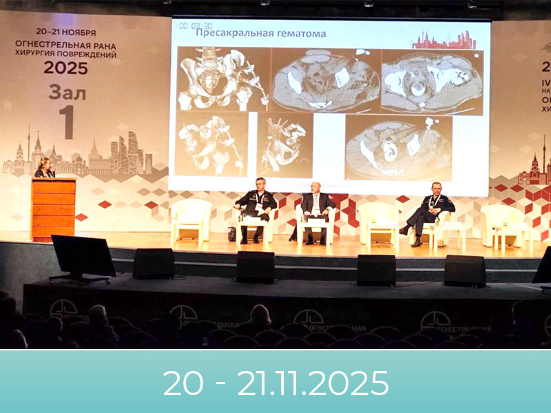 20 - 21 ноября 2025 г. в Москве состоялся IV международный научно-практический Форум «Огнестрельная рана. Хирургия Повреждений». Наше учреждение представляла к.м.н., врач-рентгенолог рентгеновского отделения Анна Владимировна Кудрявцева, которая выступила с докладом на тему: «КТ-визуализация при пельвиоабдоминальных ранениях».