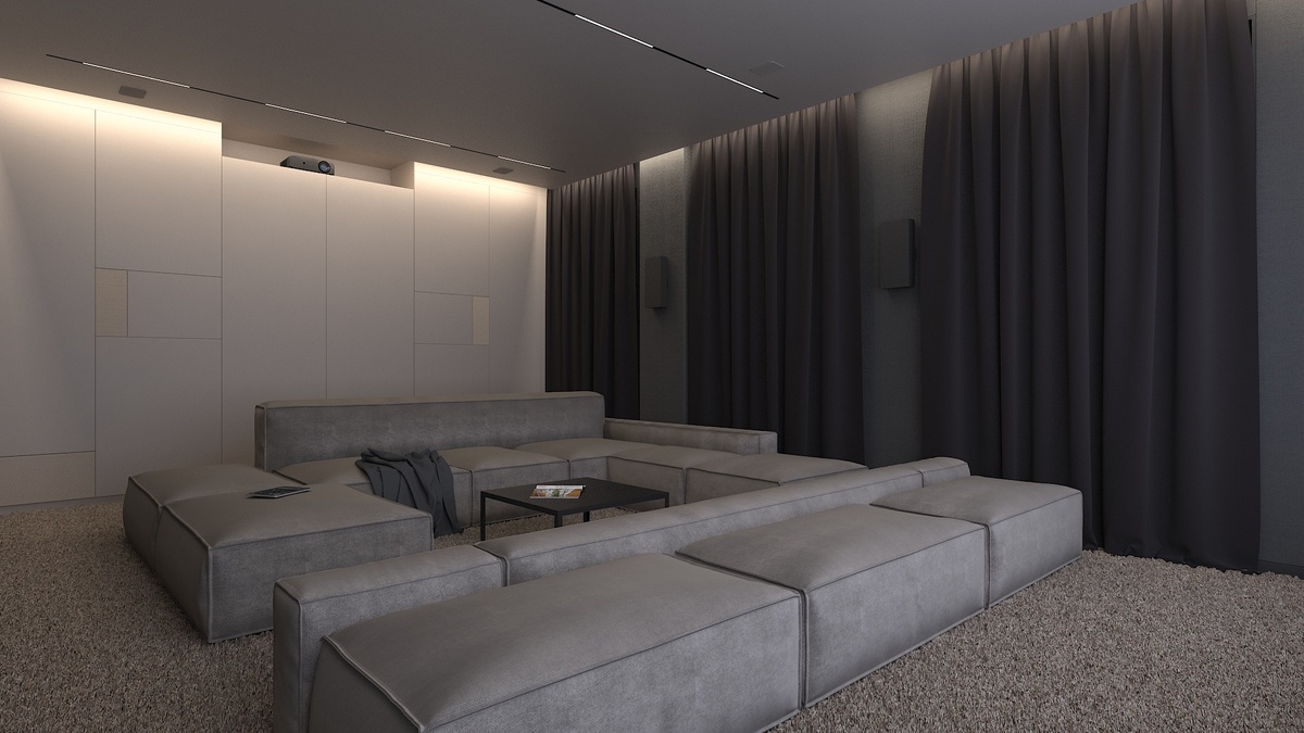 Комната предполагается как многофункциональная, в ней будут смотреть фильмы, спортивные мероприятия, а также читать книги в уединённой обстановке. Проекционный экран максимально большого размера с акустически прозрачным полотном. За ним расположены фронтальная акустические системы M&K Sound.